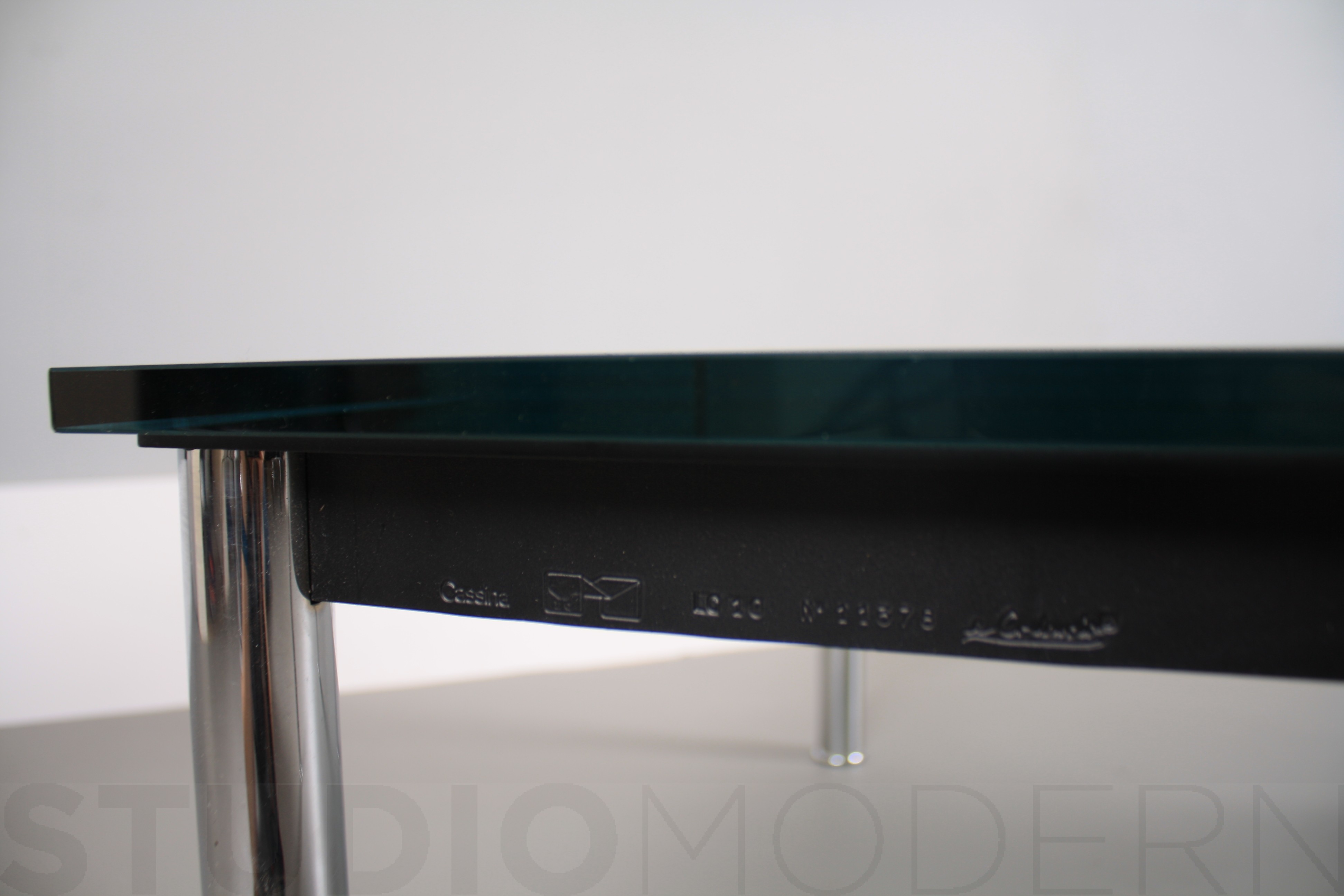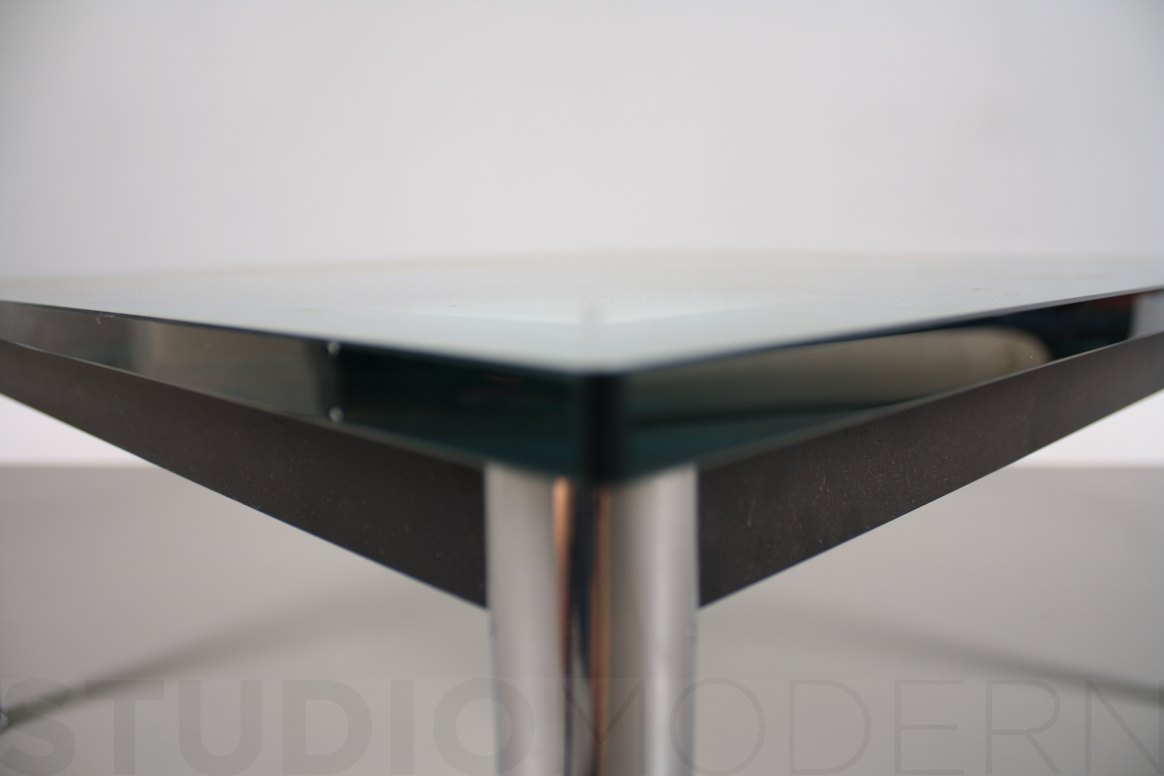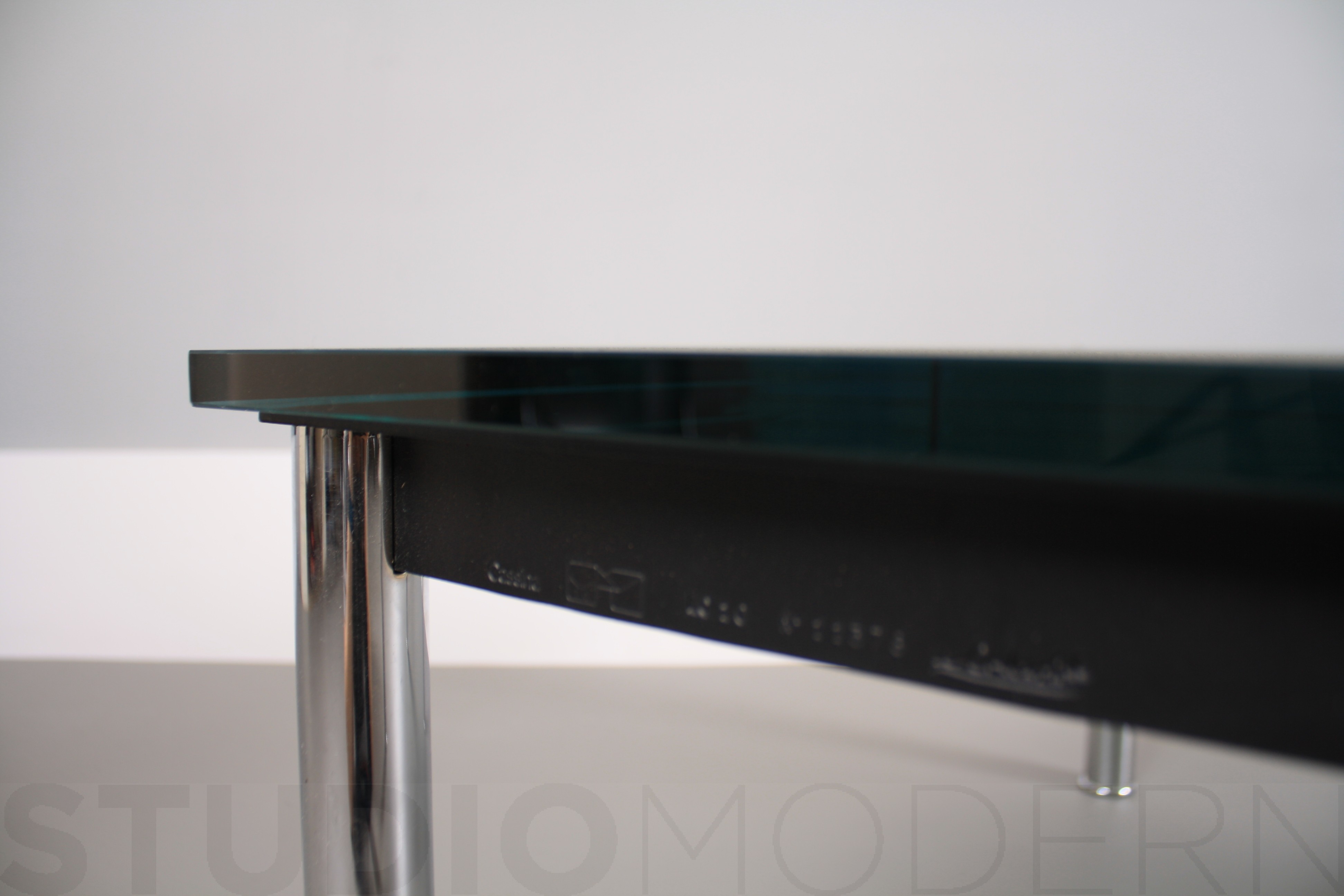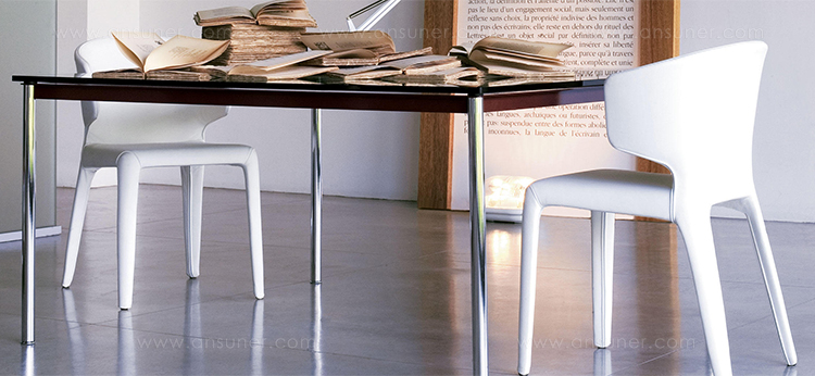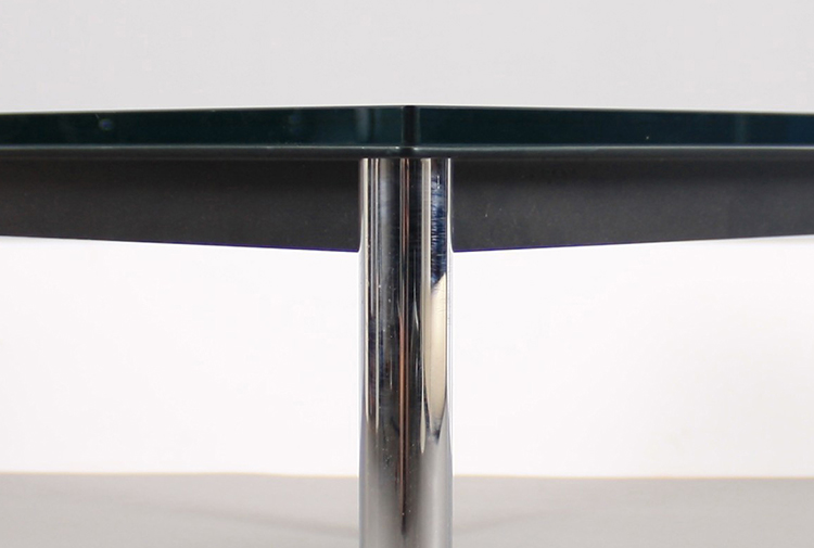 1984年改版的Charlotte Perriand LC10桌子。CR3三价镀铬钢结构涂哑光漆,有多种色彩选择:灰、淡蓝、绿、棕,泥土和象牙或黑色。玻璃台面有透明和纹理两种,15mm厚。也有户外版本。长宽高120x80x70cm, 看起来像是1929年巴黎秋季沙龙中参展的桌子,“居室的装置”的一部分。这款桌子最大地简化了框架,镀铬管状桌腿和喷漆的边饰都很极简,金属处理的表现力实现了桌子的完美效果。