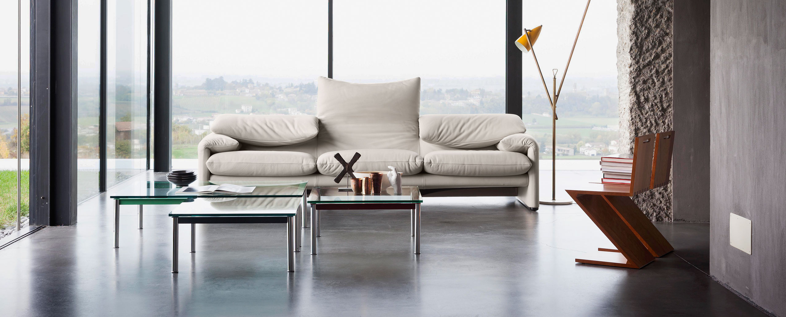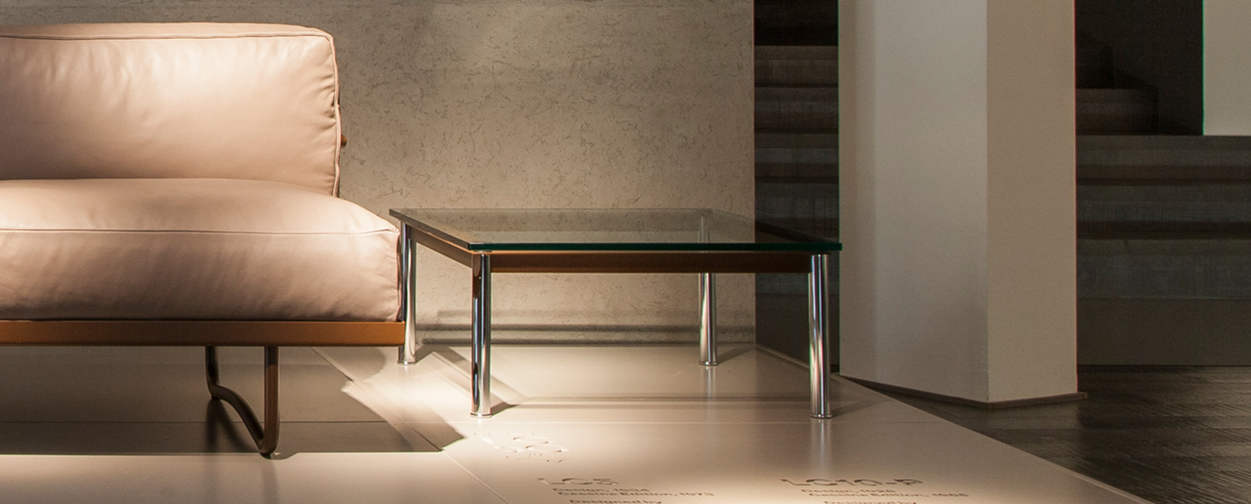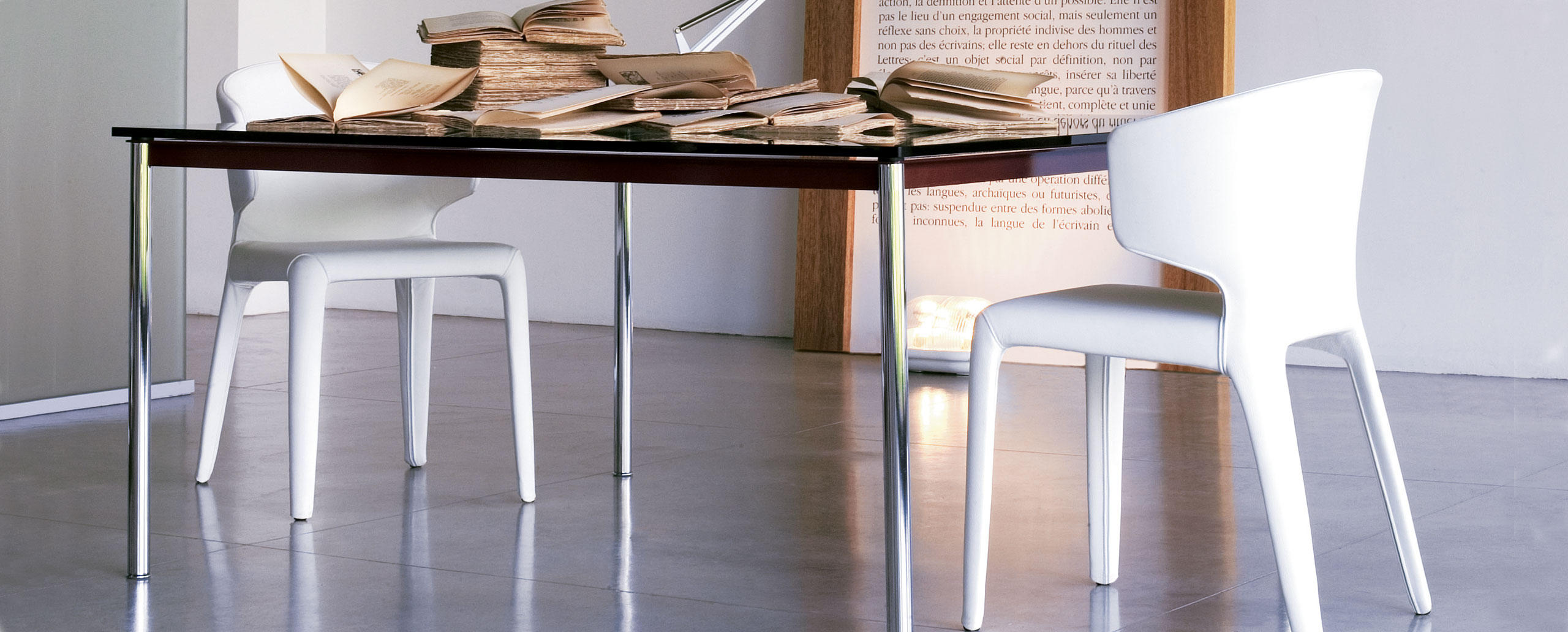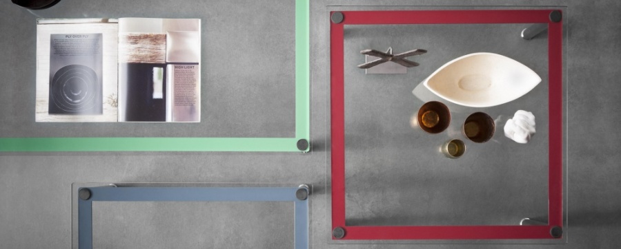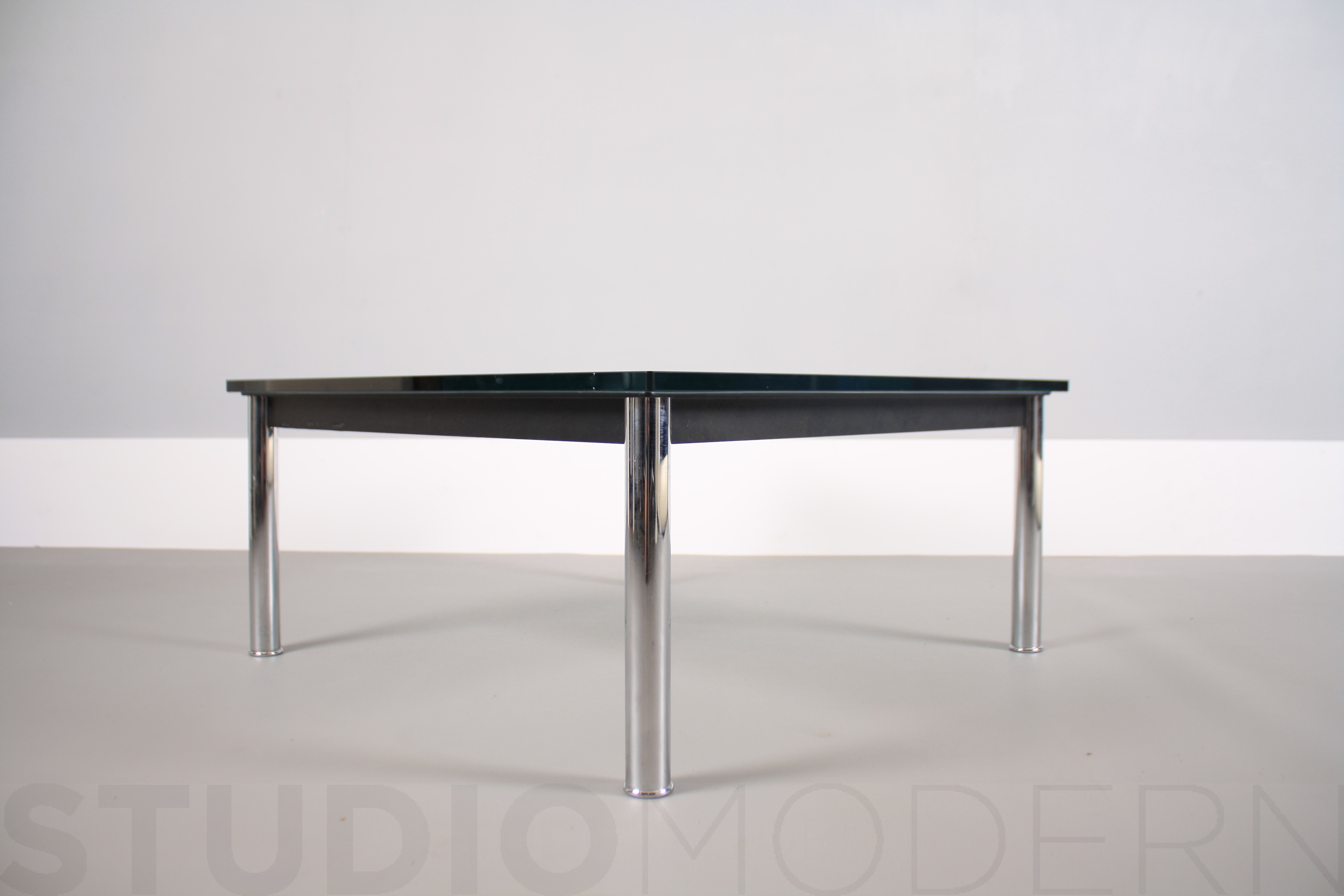 1984年改版的Charlotte Perriand LC10桌子。CR3三价镀铬钢结构涂哑光漆,有多种色彩选择:灰、淡蓝、绿、棕,泥土和象牙或黑色。玻璃台面有透明和纹理两种,15mm厚。也有户外版本。长宽高120x80x70cm, 看起来像是1929年巴黎秋季沙龙中参展的桌子,“居室的装置”的一部分。这款桌子最大地简化了框架,镀铬管状桌腿和喷漆的边饰都很极简,金属处理的表现力实现了桌子的完美效果。