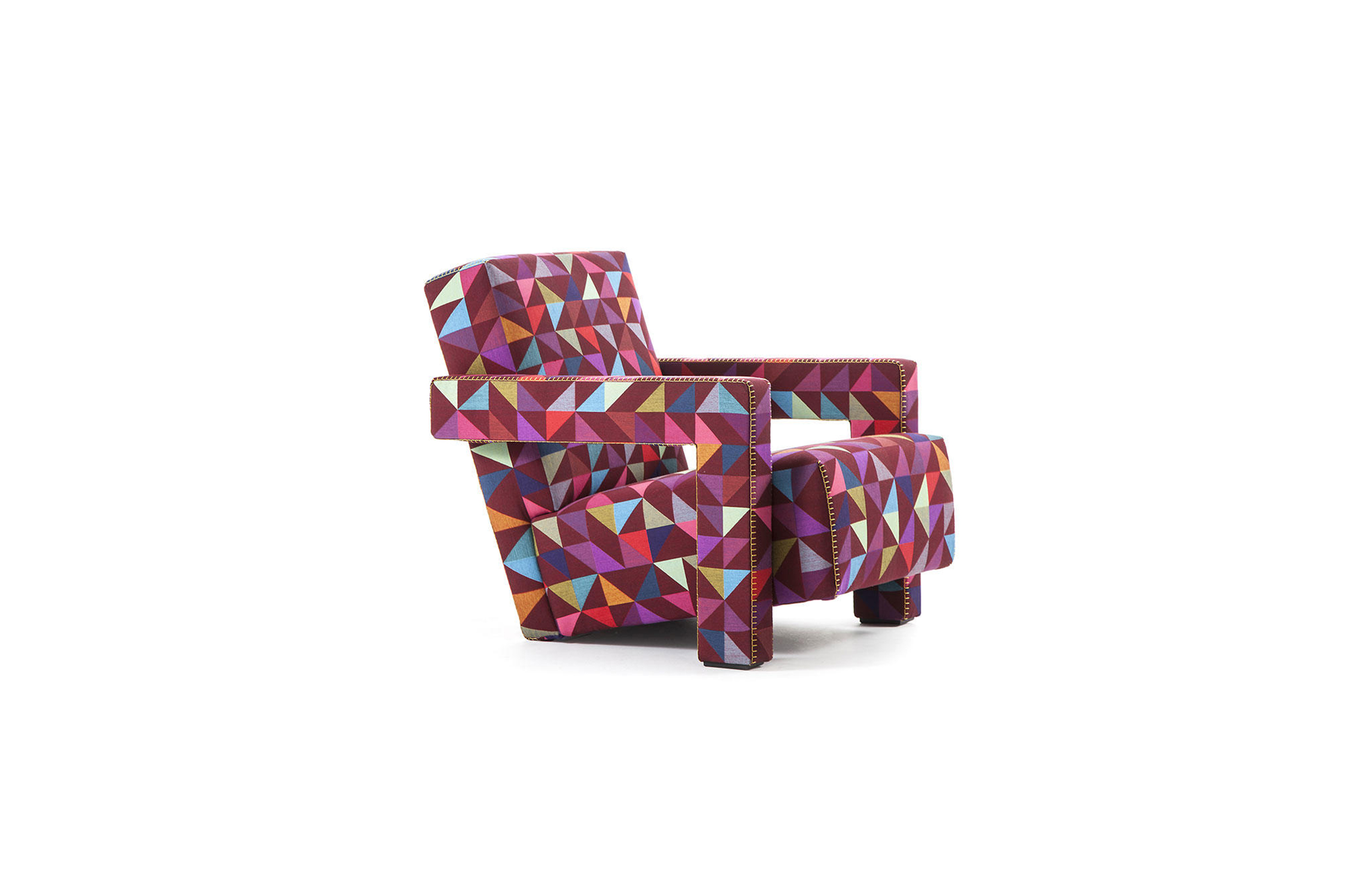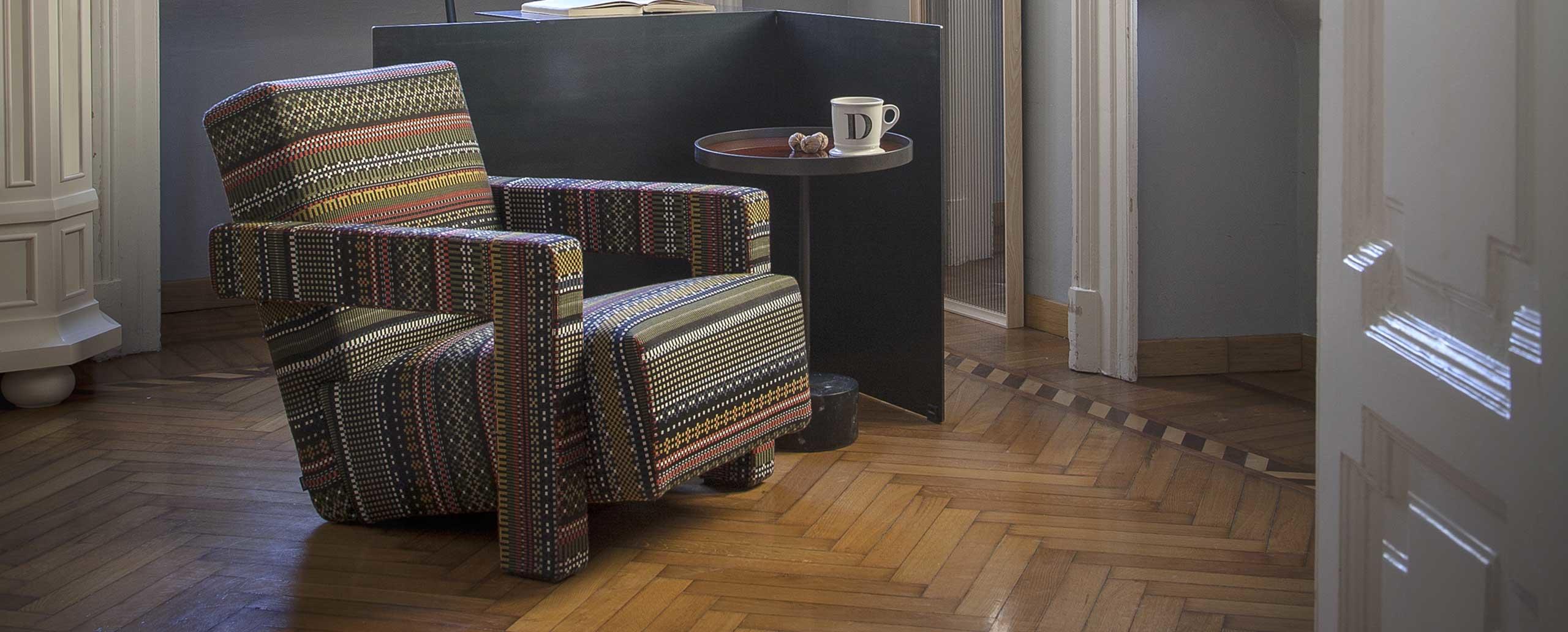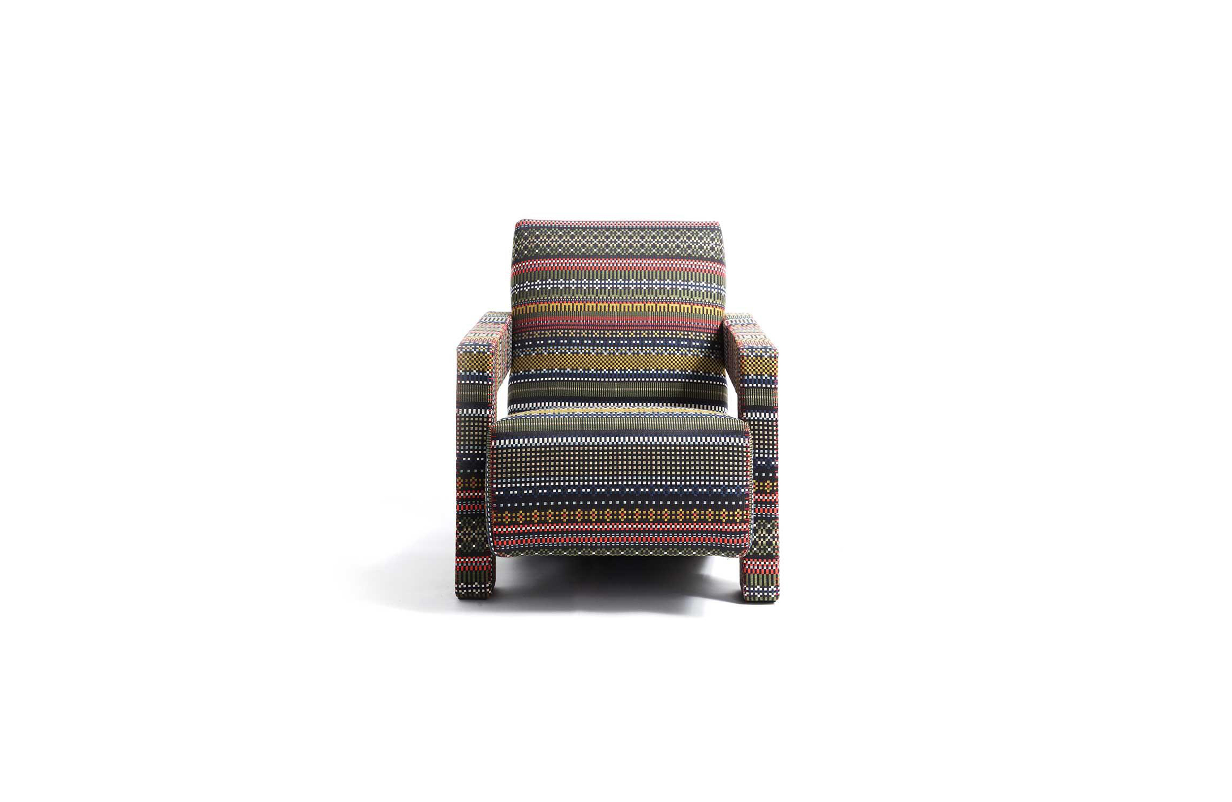 Rietveld是一位荷兰建筑师,他有强烈的实验倾向,他和蒙德里安是1917年新塑料德斯提尔运动的创始人之一,于1935年设计了Utrecht模型。这个模型是为阿姆斯特丹的Metz&co百货公司创建的,因此为大众市场设计,并代表Rietveld决定采用更“市场导向”的方式来舒适和放松。以五种不同颜色的两种可见的拼接(鞍针或齐格扎格)为例,强调了元素的分解。