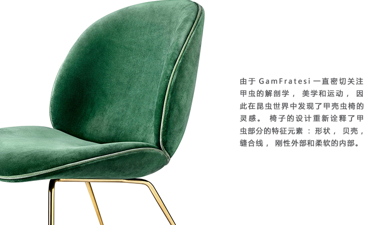 由于GamFratesi一直密切关注甲虫的解剖学,美学和运动,因此在昆虫世界中发现了甲壳虫椅的灵感。 椅子的设计重新诠释了甲虫部分的特征元素:形状,贝壳,缝合线,刚性外部和柔软的内部。