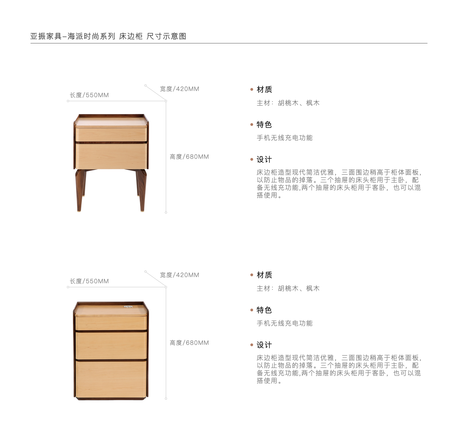 床边柜造型现代简洁优雅,三面围边稍高于柜体面板,以防止物品的掉落。三个抽屉的床头柜用于主卧,配备无线充功能,两个抽屉的床头柜用于客卧,也可以混搭使用。