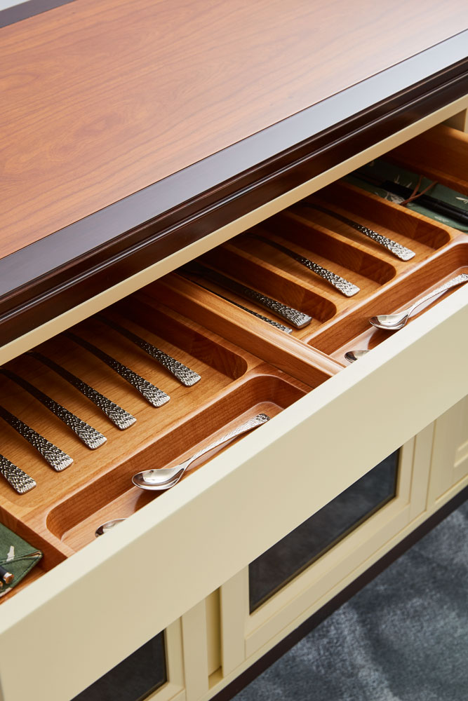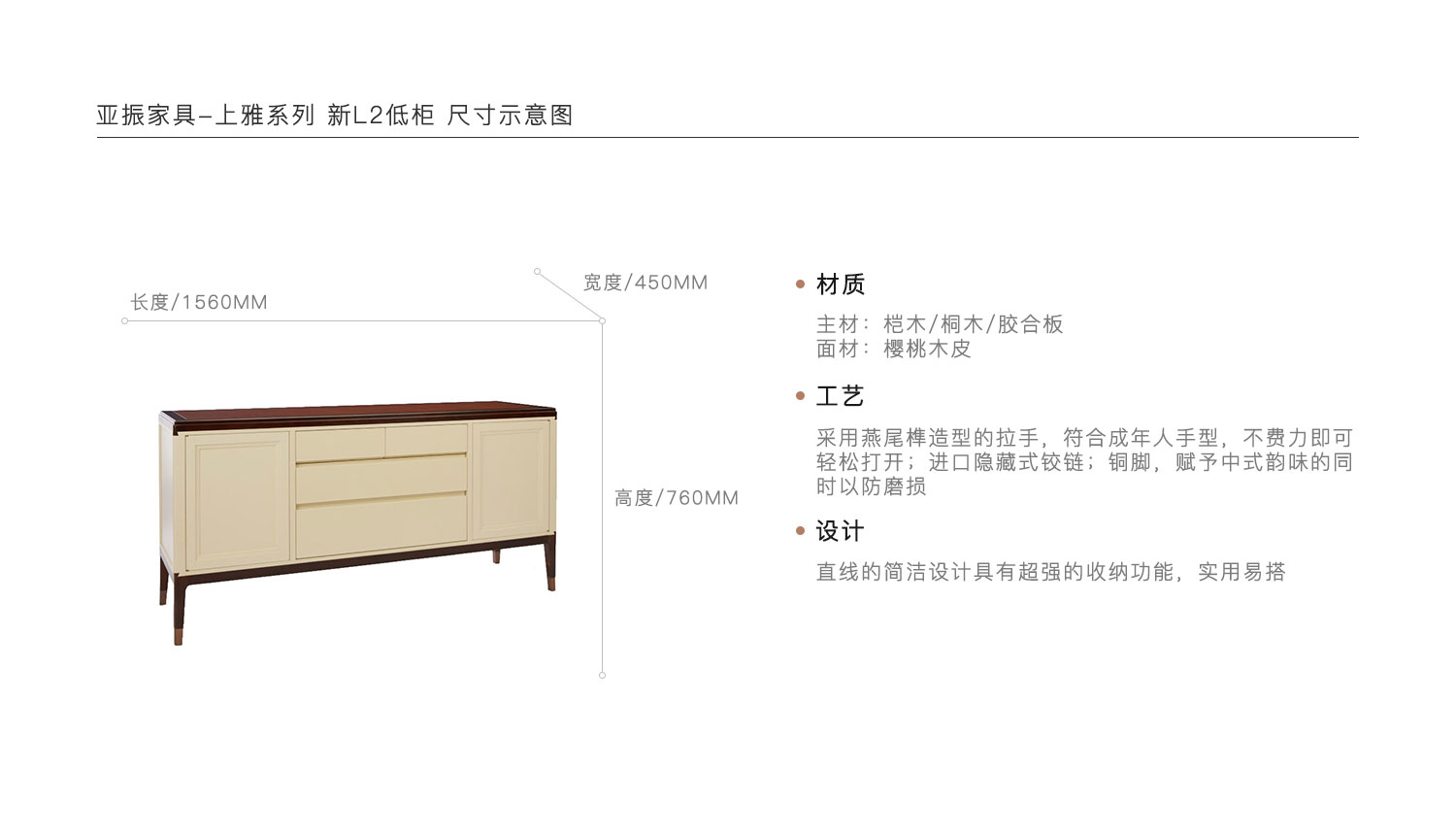 采用燕尾榫造型的拉手,符合成年人手型,不费力即可轻松打开;进口隐藏式铰链;铜脚,赋予中式韵味的同时以防磨损。直线的简洁设计具有超强的收纳功能,实用易搭。