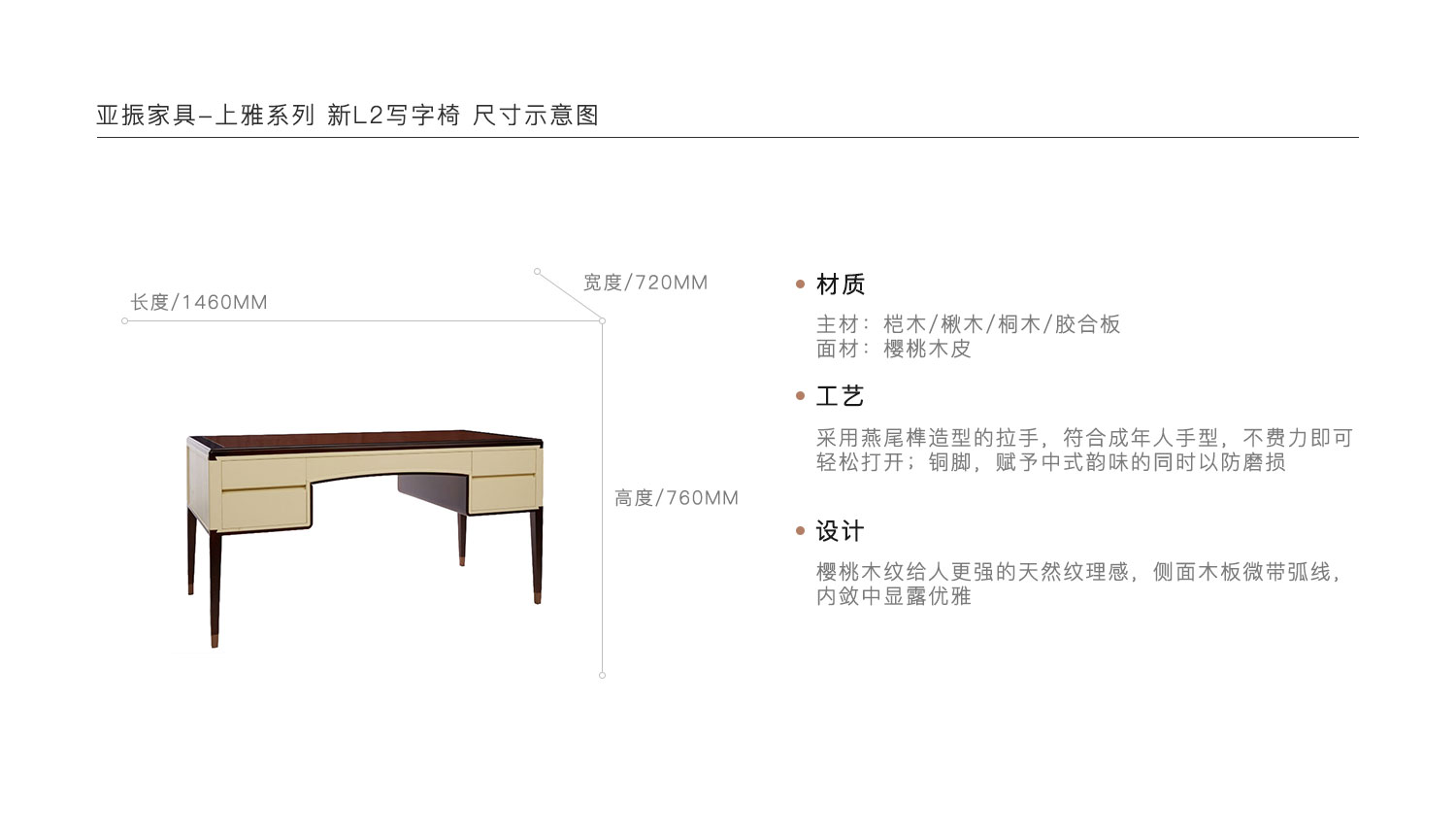 采用燕尾榫造型的拉手,符合成年人手型,不费力即可轻松打开;铜脚,赋予中式韵味的同时以防磨损。樱桃木纹给人更强的天然纹理感,侧面木板微带弧线,内敛中显露优雅。