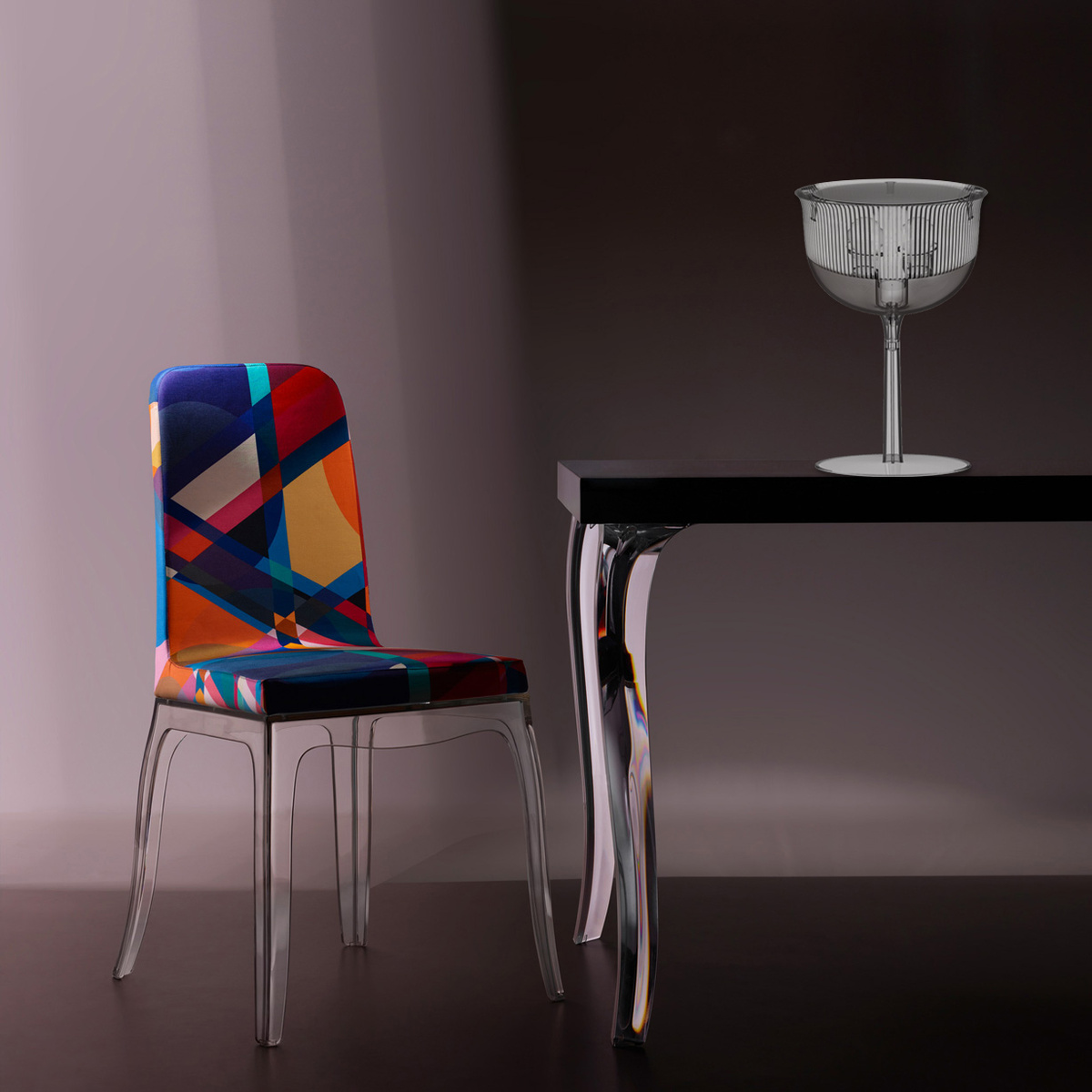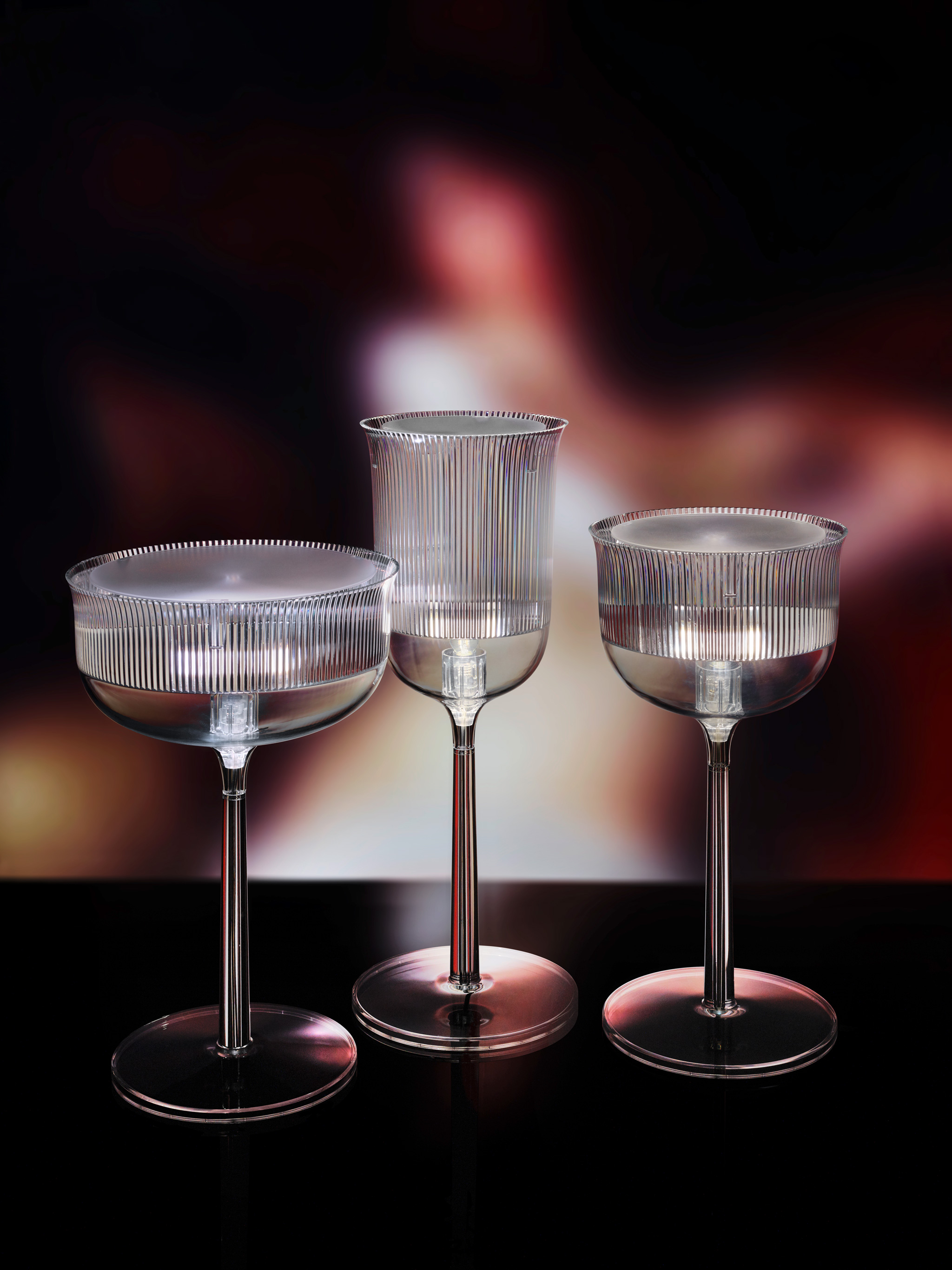 这款经典的水晶玻璃从原来的比例中拿出来,变成了三种不同形状的台灯,类似于香槟长笛、高脚杯和圣杯。