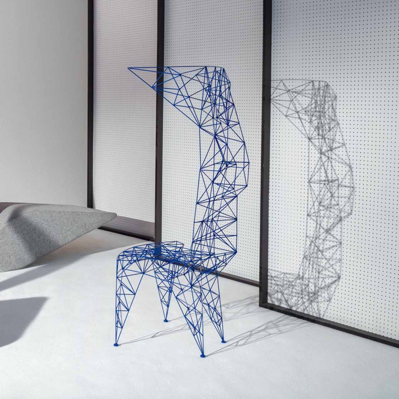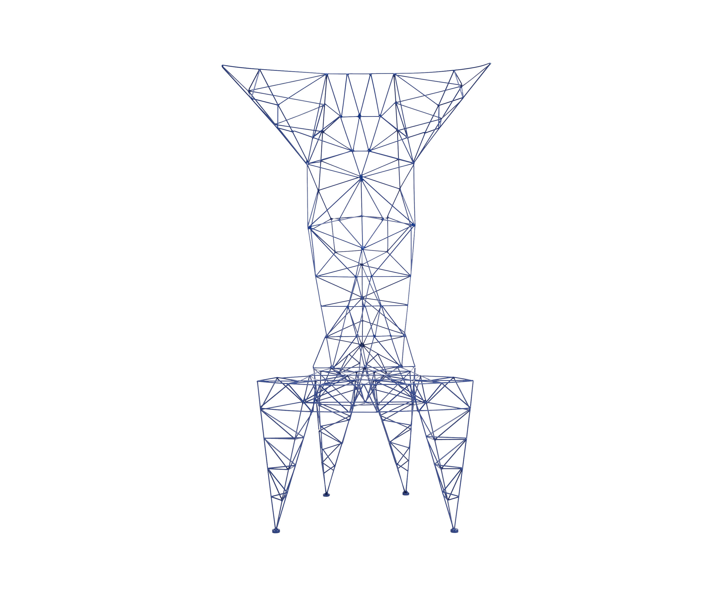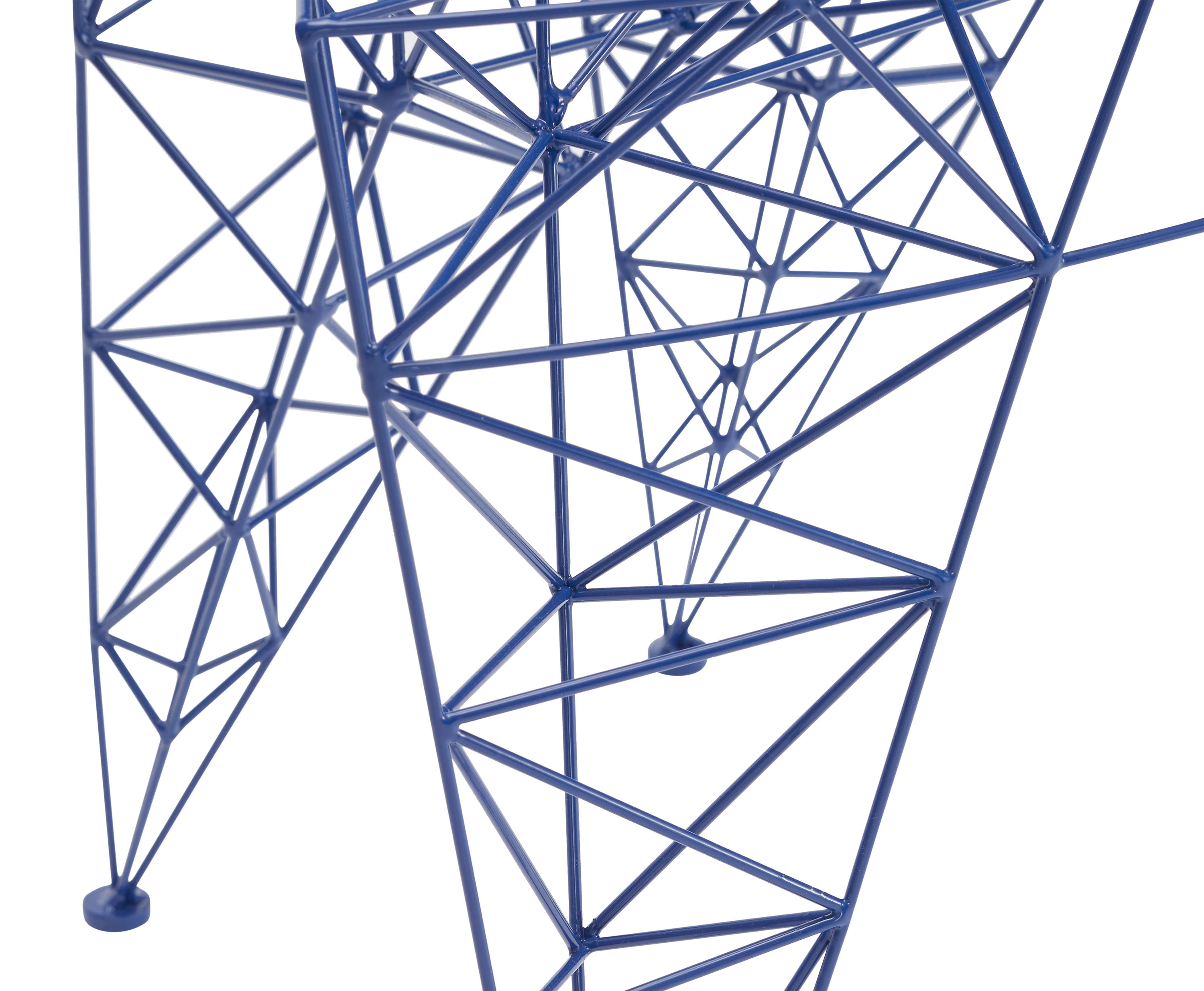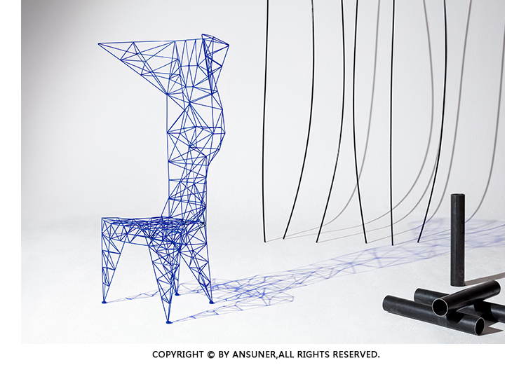 3mm直径钢杆的晶格功是最大强度的三角化-这是一种在纯朴素结构中的练习。最初的灵感来源于早期的电脑编程、电塔和桥梁的建筑模型都清晰可见这是自学结构工程的快乐练习。现在粉末涂在明亮的皇家蓝色的塔椅,虽然可能不是世界上最舒适的椅子,却是最可识别和独特的。