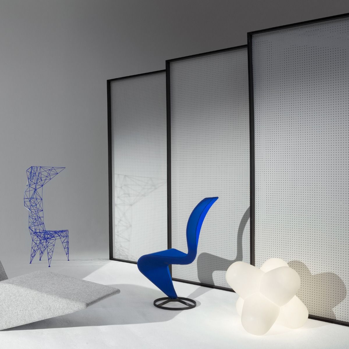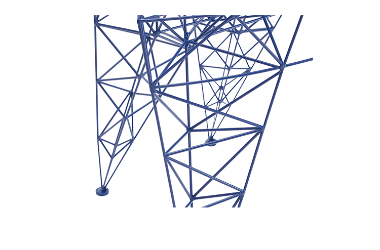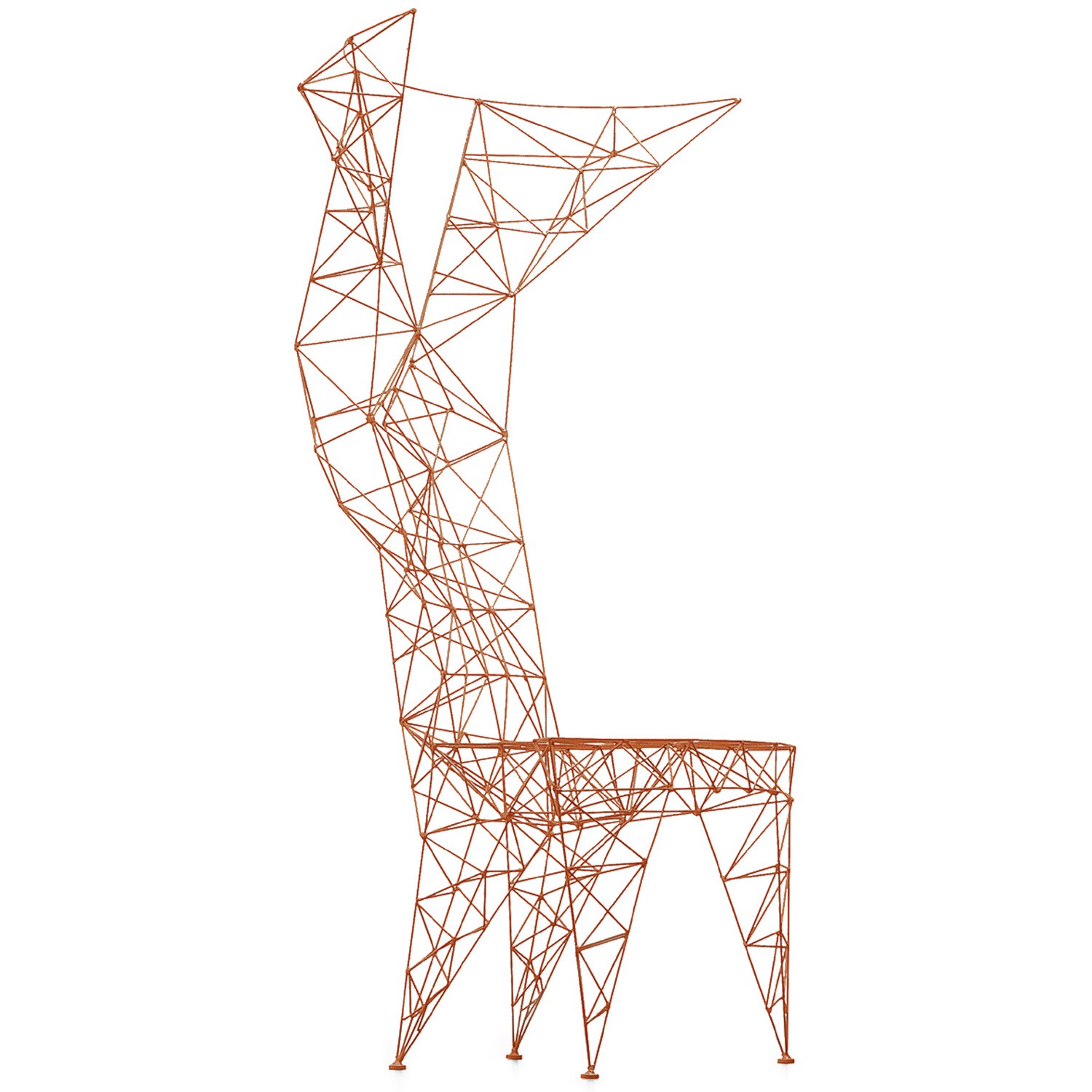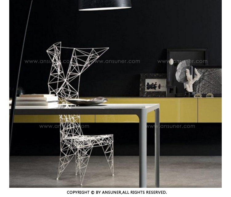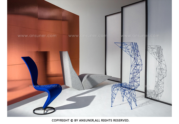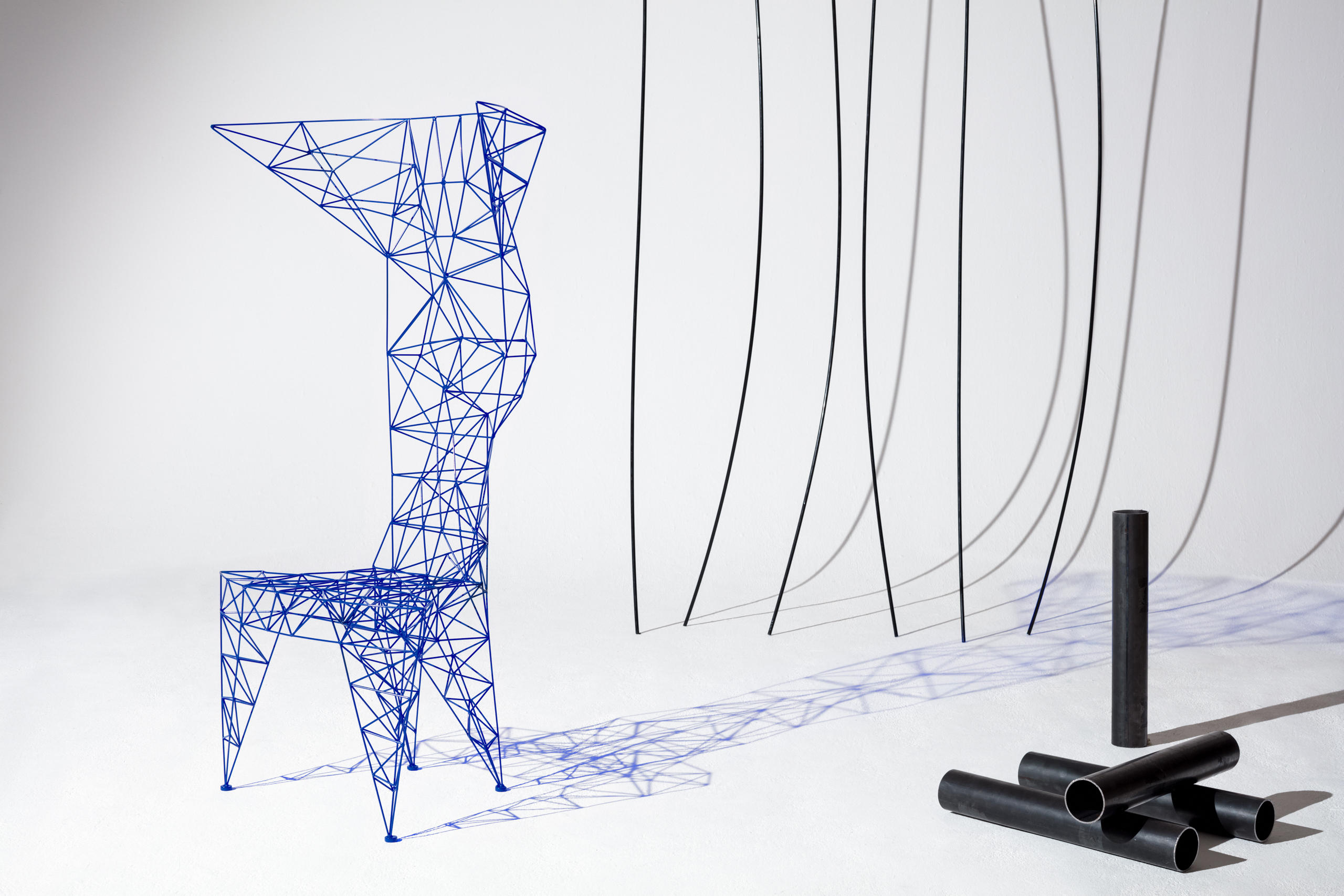 3mm直径钢杆的晶格功是最大强度的三角化-这是一种在纯朴素结构中的练习。最初的灵感来源于早期的电脑编程、电塔和桥梁的建筑模型都清晰可见这是自学结构工程的快乐练习。现在粉末涂在明亮的皇家蓝色的塔椅,虽然可能不是世界上最舒适的椅子,却是最可识别和独特的。