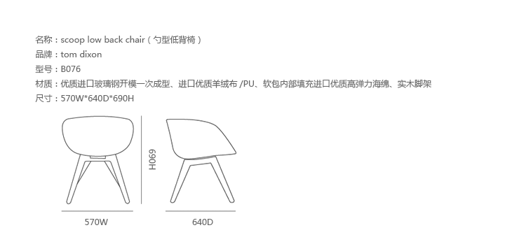 Tom Dixon设计的Scoop系列休闲椅有两个版本,高背和低背,命名为:Scoop Low Back Chair(勺型低背椅)和Scoop High Back Chair(勺型高背椅),造型像一只汤勺,因而取名Scoop。Scoop休闲椅的制作结合实木脚架搭配层压板椅座,其流畅且精致的外观造型,只需要一个很小的区域便能散发出简约低调的质朴美感。