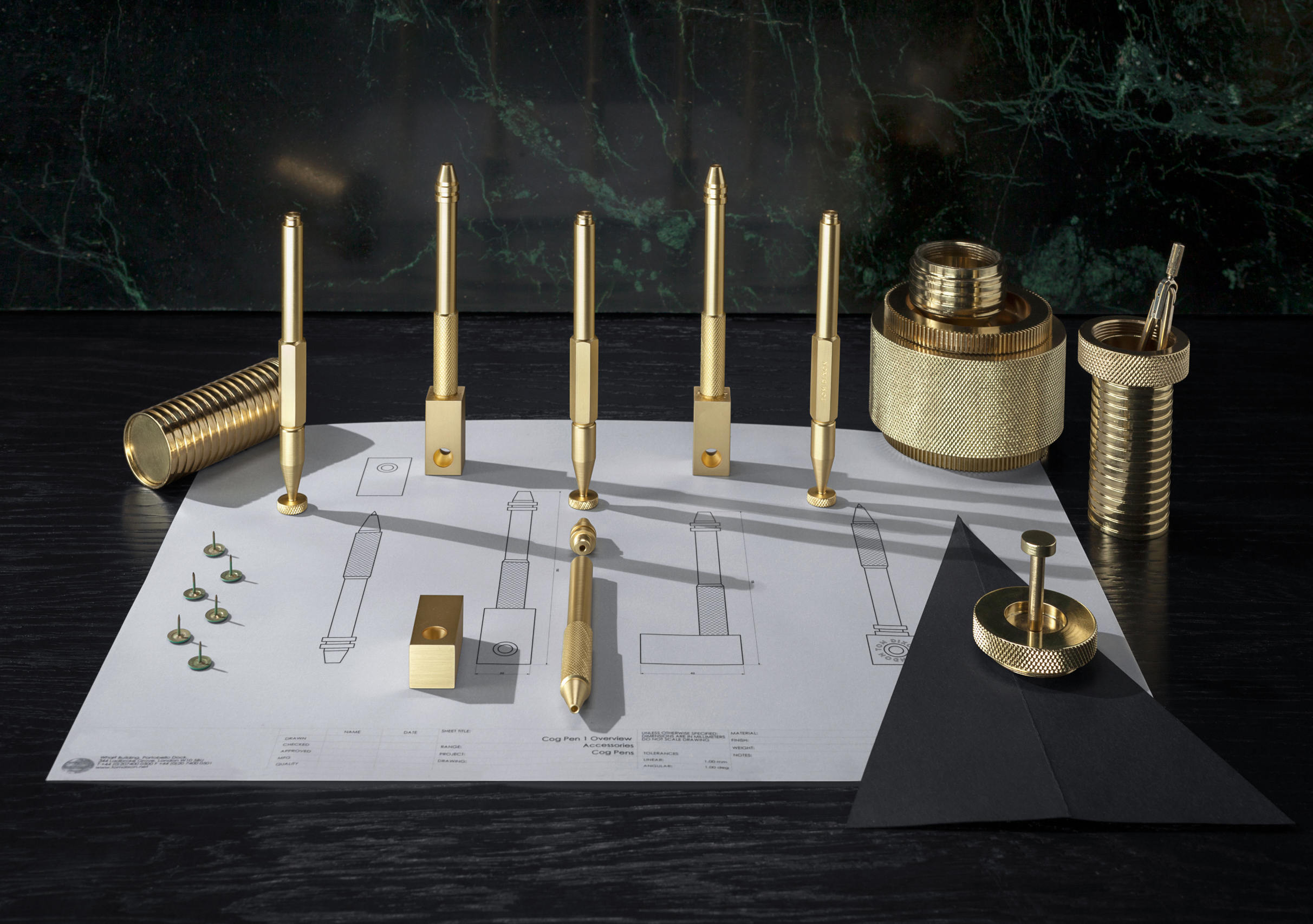 实心铝质生料块和管材在车床上进行加工,使用传统的精密机床进行切削和滚花。然后进行抛光,镀铜和抛光,最后用漆完成。标志深深地刻在底座上。