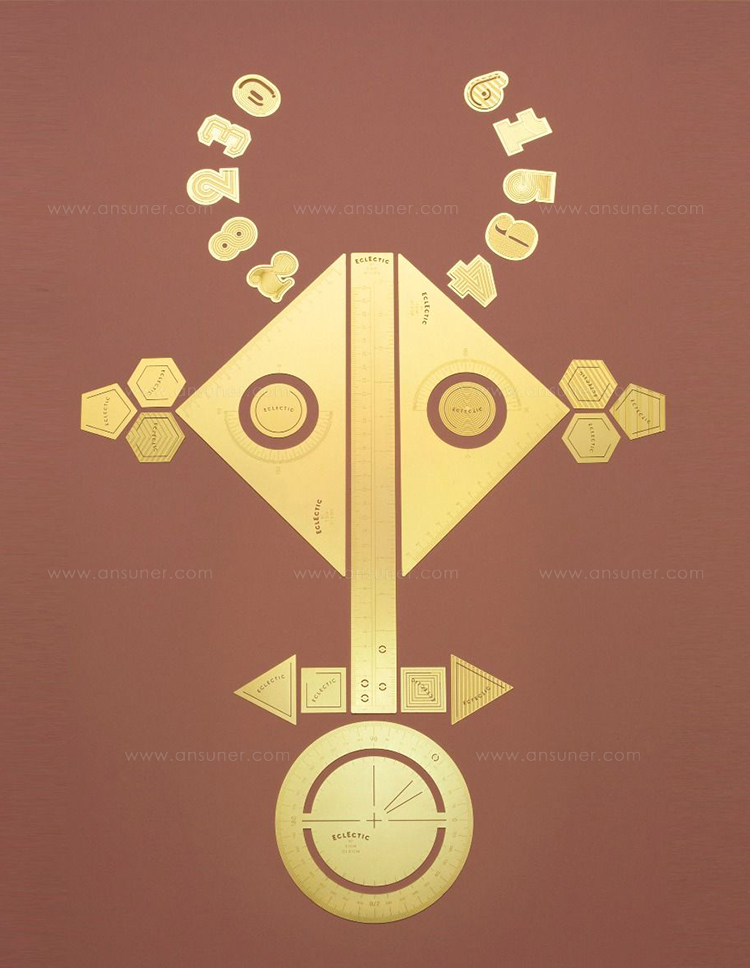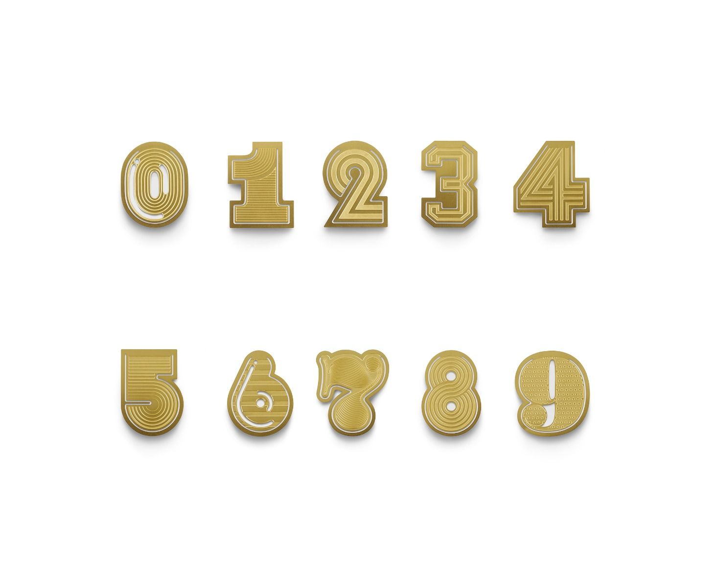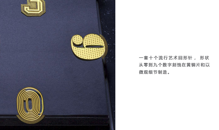 一套十个流行艺术回形针,形状从零到九个数字刻蚀在黄铜片和以微观细节制造。