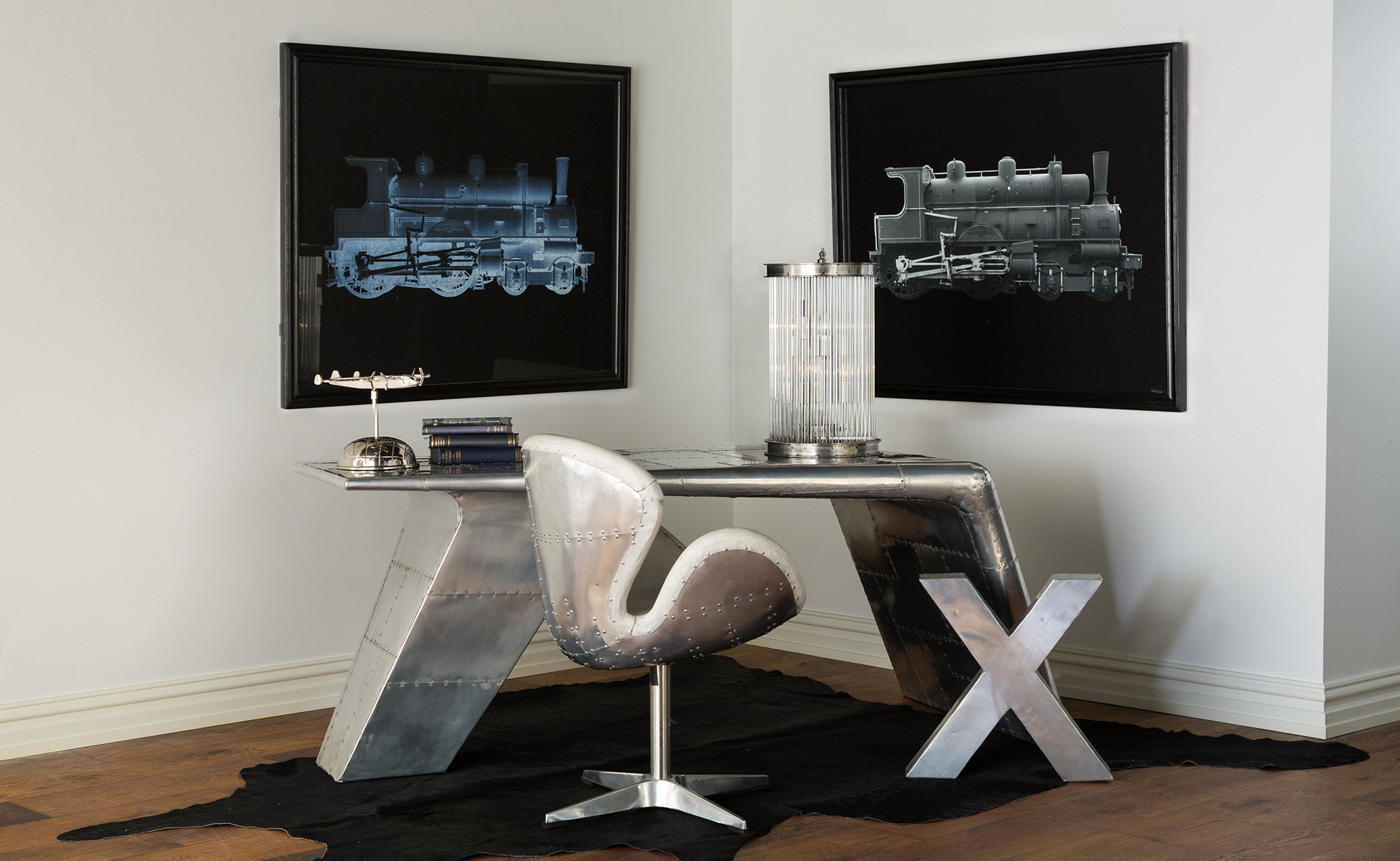 Aviator Valkyrie Desk(飞行员瓦尔基里台)由英国著名设计师Timothy Oulton设计,灵感来源于1960年北美航空的超音速轰砸飞机XB70,并以此命名。瓦尔基里台用铆接铝板制造,弧形线条符合空气动力学,有如一双机翼,通过手工艺进行打磨,进行磨光,座子整体造型有如喷火战机或黑色喷火式战斗机。