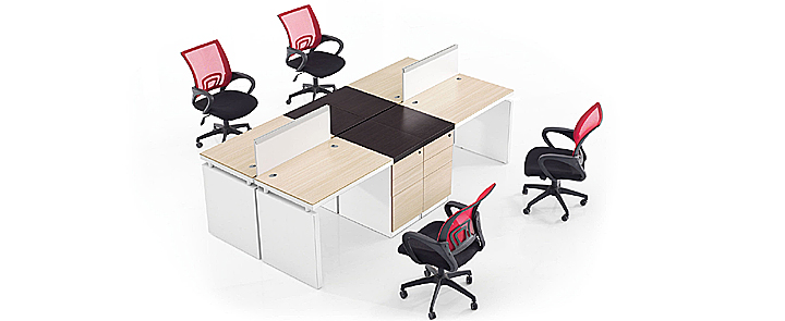 ※  以三胺板叠加作为侧脚板,或者以木质文件柜作为台脚,明亮开放的工作站设计,多种形状的排布组合,文件柜的区域的充分利用,增大办公的空间感!