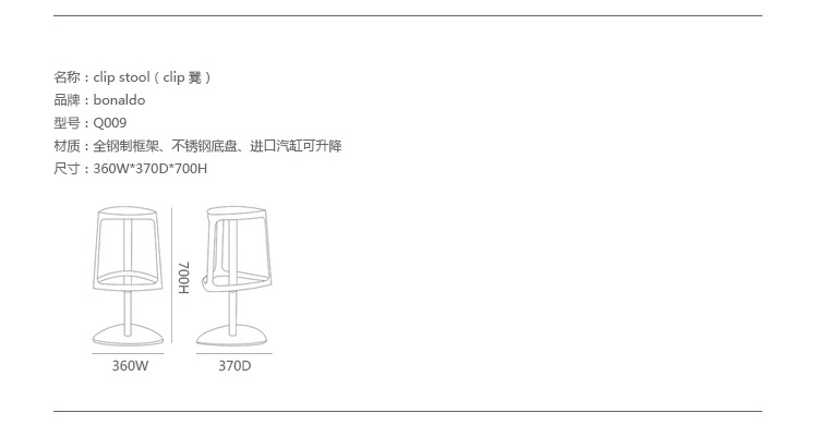 Clip Stool(剪辑吧凳)是国际著名设计大师,科隆“杜邦”奖、米兰“青年设计奖”、罗马“casaidea”奖的获得者,吉诺卡罗洛(Gino Carollo)先生设计的经典作品。Clip Stool(剪辑吧凳)是一具有时尚气息的吧凳,造型简单优美,但不失华丽大方,可适用于家庭,酒吧,以及餐馆等。通过气体活塞,您可以随意调整坐姿和高度,吧凳造型像一三角形,就连底盘也设计成三角形的形状,不同颜色搭配在一起,可产生一种有趣高雅的情调。