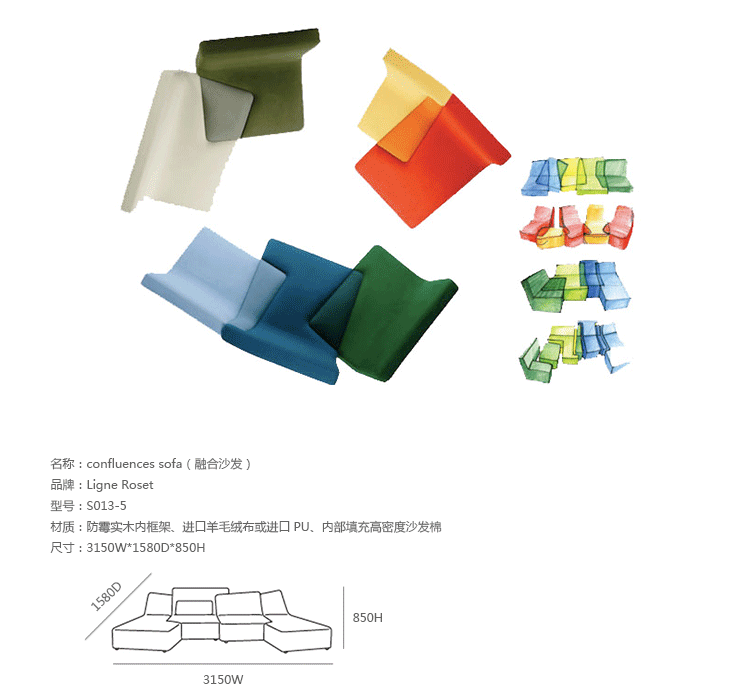 法国写意空间公司(Ligne Roset)在今年的科隆国际家具展上展出了这一款Confluence模块沙发,并获得了最佳设计奖(Best of Best)、最佳项目奖(Best Item)及最佳系列奖(Best System)三个奖项。Confluence模块沙发由法国设计师Philippe Nigro设计,这款沙发非常规的外型构造突显了设计师非凡的想象力和创造力,其相互交汇的构造看上去就像拼图一样充满趣味,而这种造型无疑也会给其陈设空间带来一种新鲜感。Confluence模块沙发可让使用者随其心意而将不同颜色、不同形状的模块搭配成各种组合,这也使其为体型不同,审美有异的各类人群都提供了个性化的就坐方式。设计师的创作灵感来自于现代美术作品中重叠的图形和笔直的线条,而略去了传统家具设计经常遵循的对称原则。Confluence模块沙发由多层木板和焊接钢片作为框架,内部由各种密度的聚醚泡沫材料填充,其表面面料为聚酯纤维织物,沙发脚由黑色聚丙烯制成。Confluence模块沙发各部分间相互重叠与镶嵌的方式令人眼前一亮,实用而有趣,满足了外型的美观而又充分体现了强大的功能,这应该是每件家具都追求的目标吧。