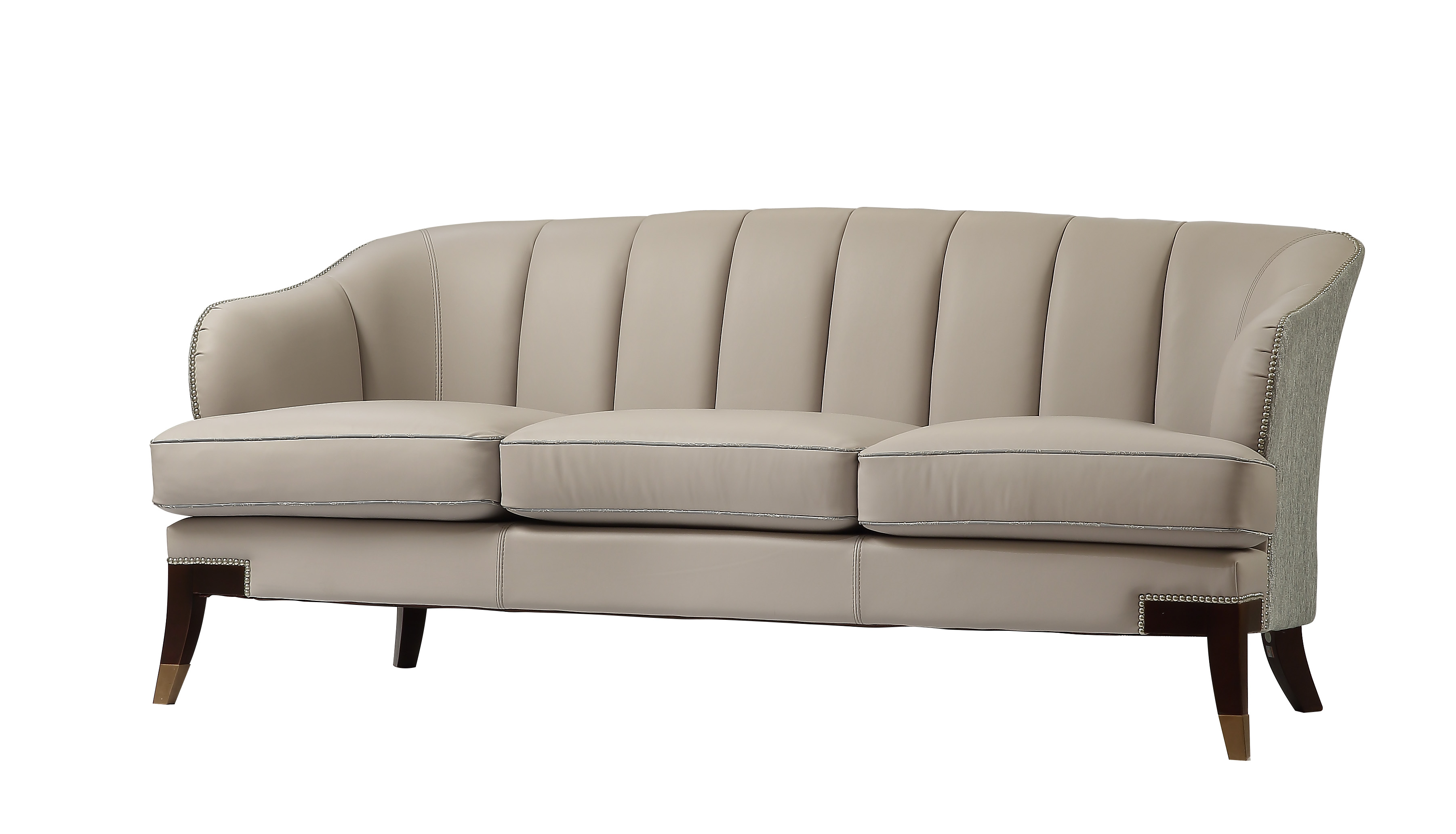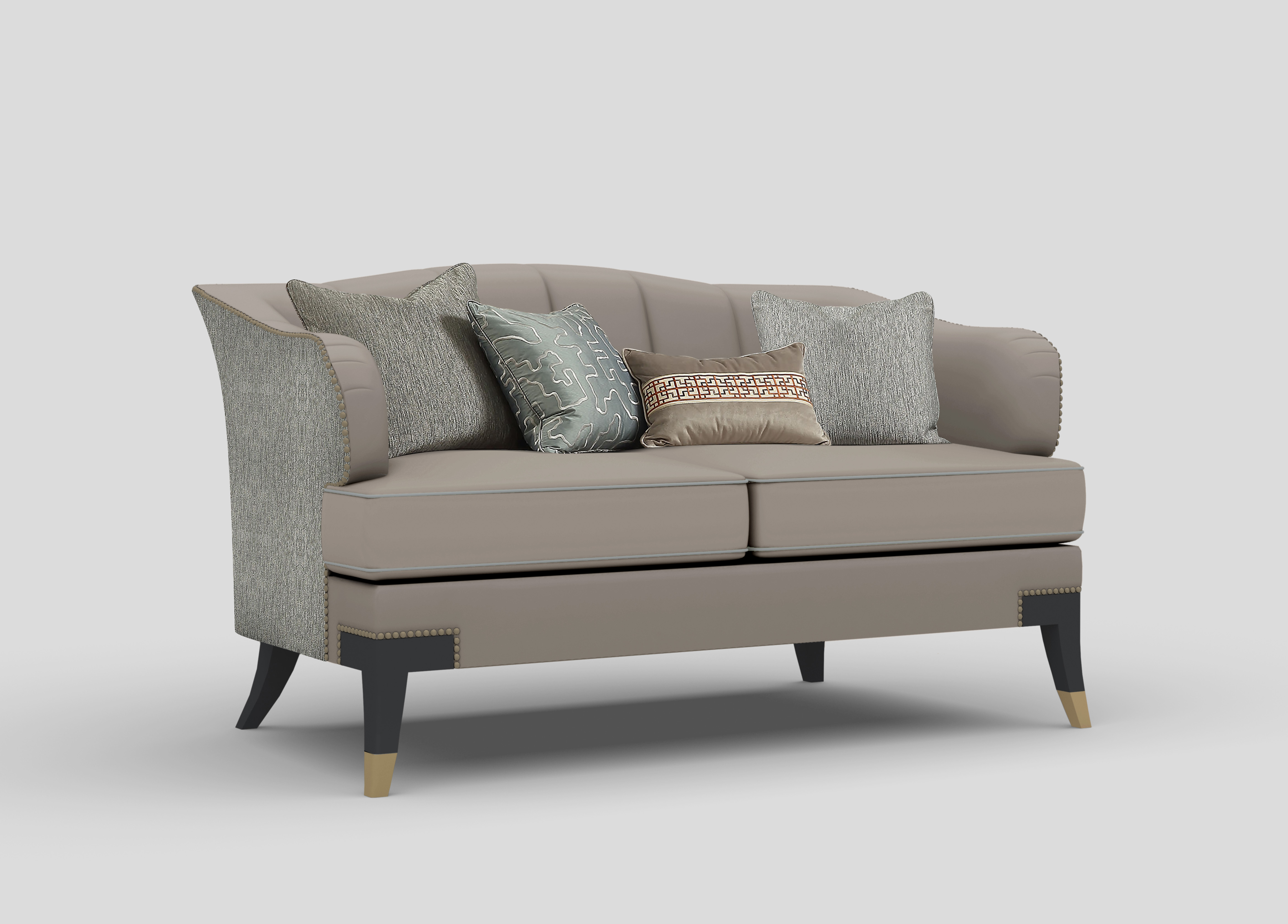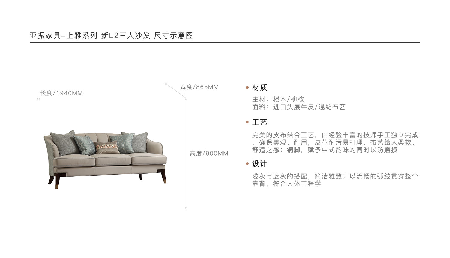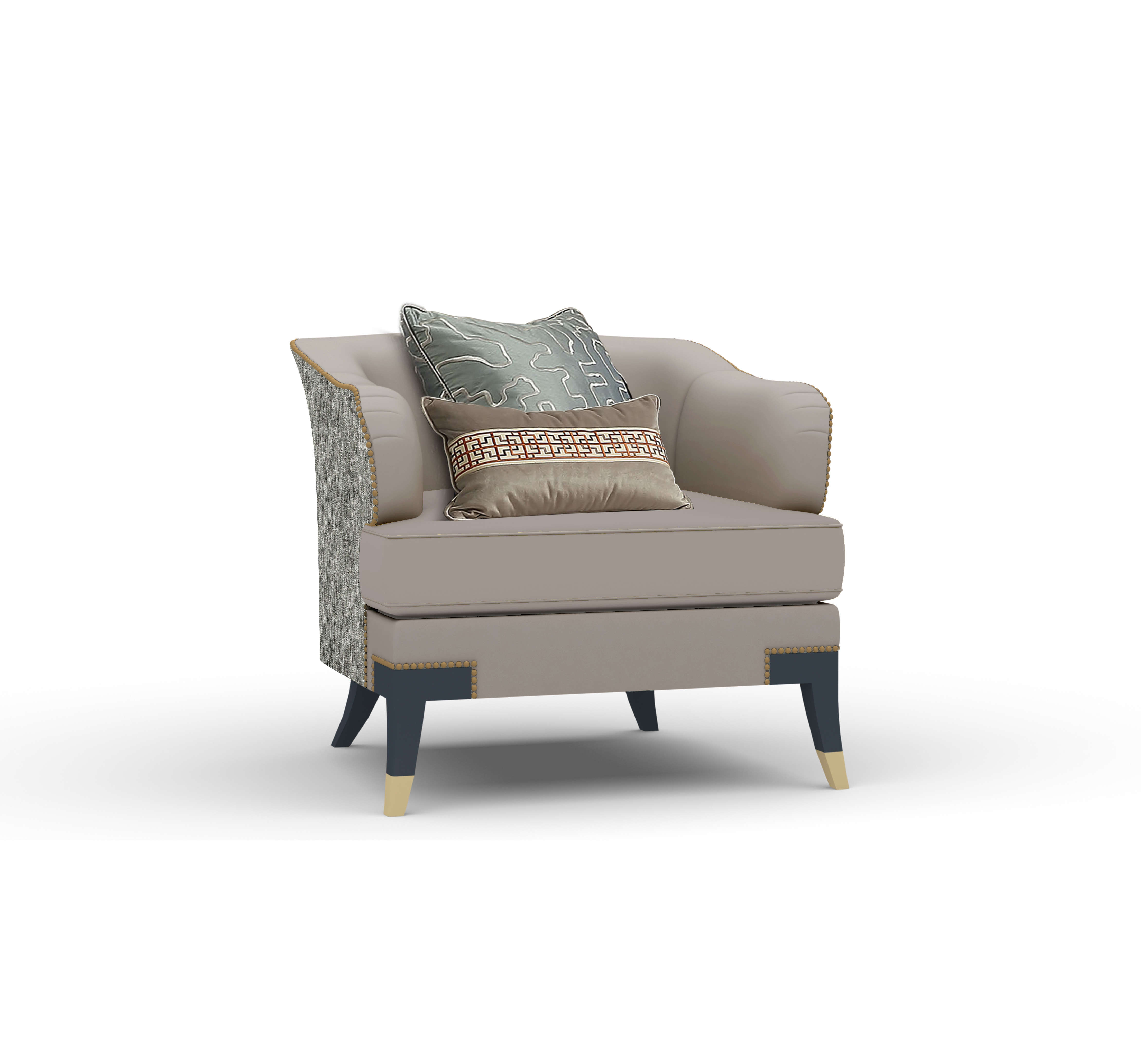 浅灰与蓝灰的搭配,简洁雅致;以流畅的弧线贯穿整个靠背,符合人体工程学。完美的皮布结合工艺,由经验丰富的技师手工独立完成,确保美观、耐用,皮革耐污易打理,布艺给人柔软、舒适之感;铜脚,赋予中式韵味的同时以防磨损。