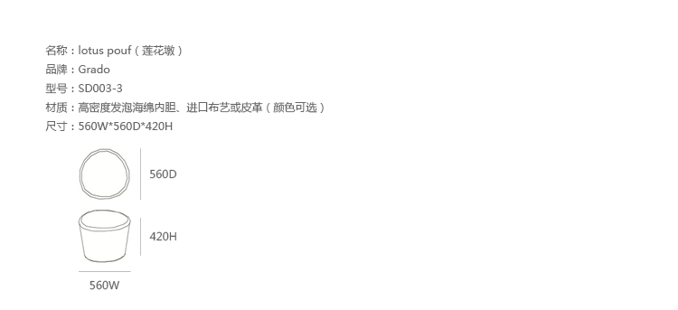 有时,它不是从零开始,Lotus Pouf(莲花墩)的设计灵感来着西湖的荷叶。它不张扬与但充满活力。Grado(歌德)设计这款莲花墩的目的是唤醒人与自然之间平衡的认知。这系列有三种尺寸和高度,多种使用方式,适合于不同大小的空间,如会议室、 会议活动的多功能厅,亦或是教室和放松的休闲区。圆形和椭圆形的形状的集合将原始设计结合多种功能︰主要用于商务会议和现代餐饮领域。莲花墩的制作使用了防霉实木内框架或玻璃钢内胆、高密度海绵、进口布艺或皮革(颜色可选)。
