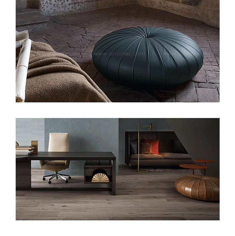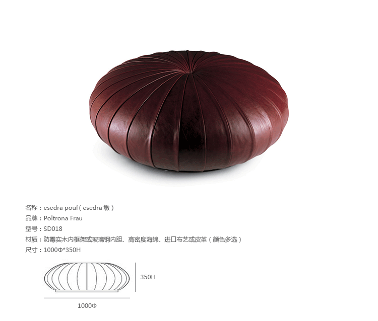 Esedra Pouf (esedra墩)是瑞典设计师Monica Forster设计的,她的灵感来自拉普兰人编织的圆形稻草篮,以圆中心为基点,向外辐射,互相重叠创建复杂的装饰效果,赋予了esedra墩古朴自然的感觉。制作采用防霉实木内框架或玻璃钢内胆、高密度海绵、优质的布艺或皮革(颜色多选),手工精细缝制。