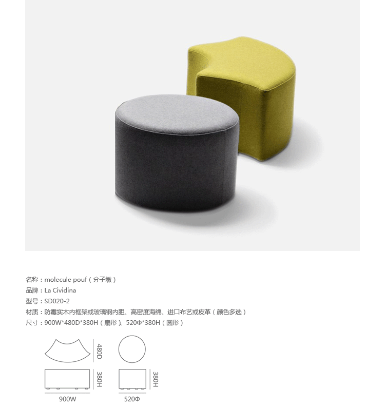Molecule Pouf(分子墩)为意大利知名设计师 Stefano Bigi 所设计的家具作品系列,此系列包括两款形状产品三叶形结构以及圆柱体结构,可搭配其他装饰的元素和小会议圆桌,您可根据喜好进行组合搭配。制作采用防霉实木内框架或玻璃钢内胆、不易变形、高密度海绵、进口布艺或皮革(颜色多选),需要提醒的是,其布艺或皮革外套是不可拆卸的。
