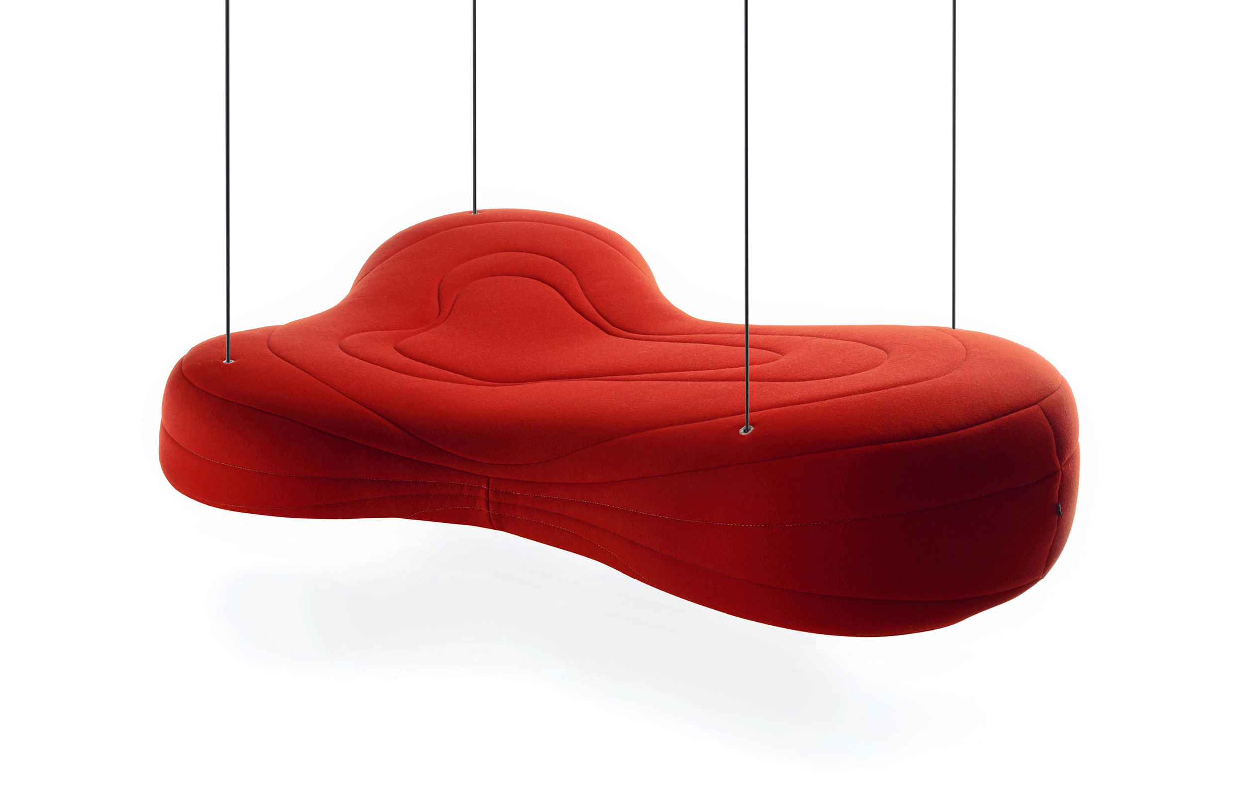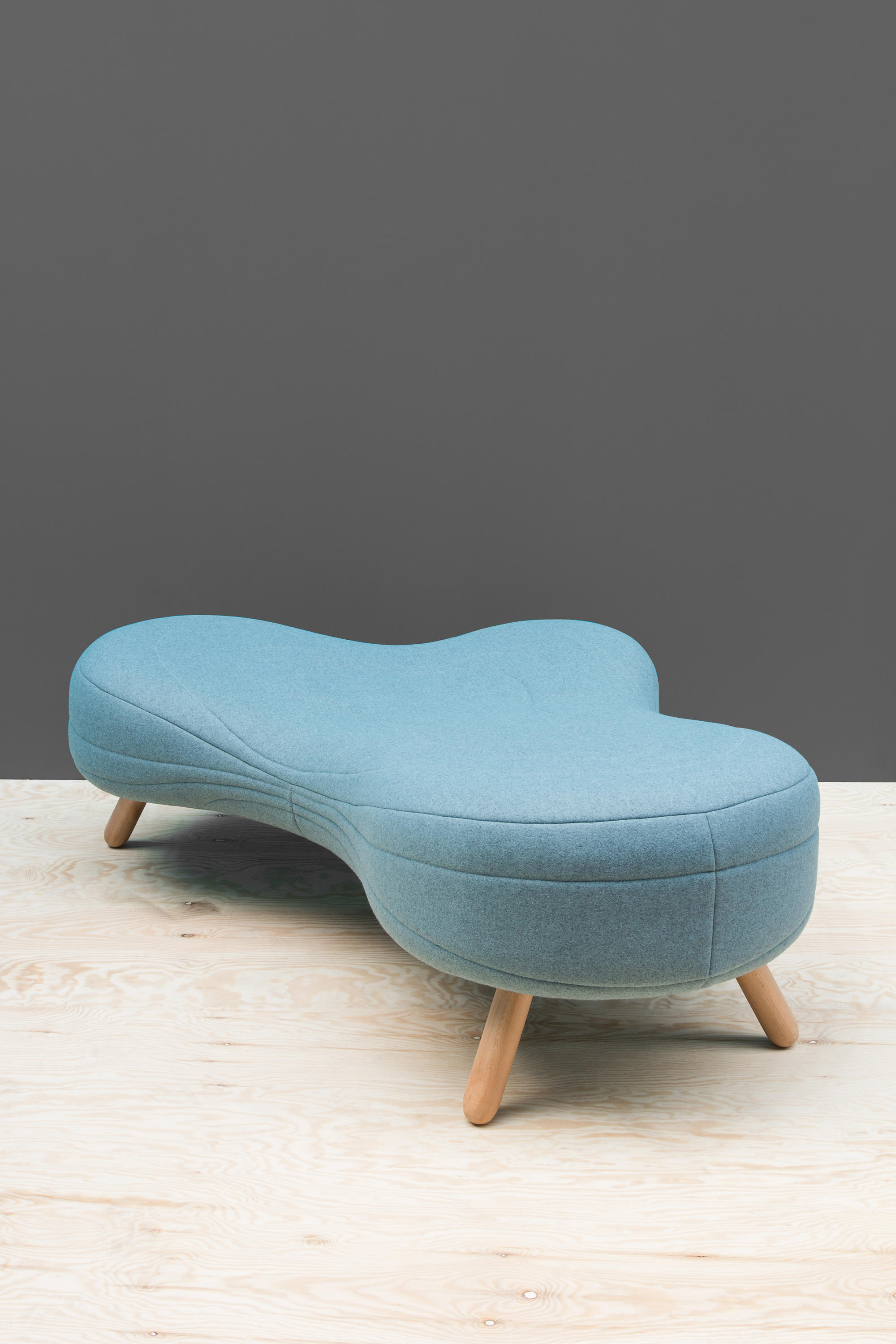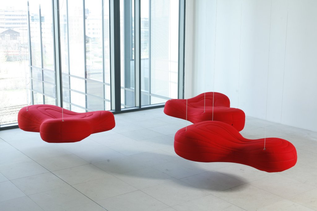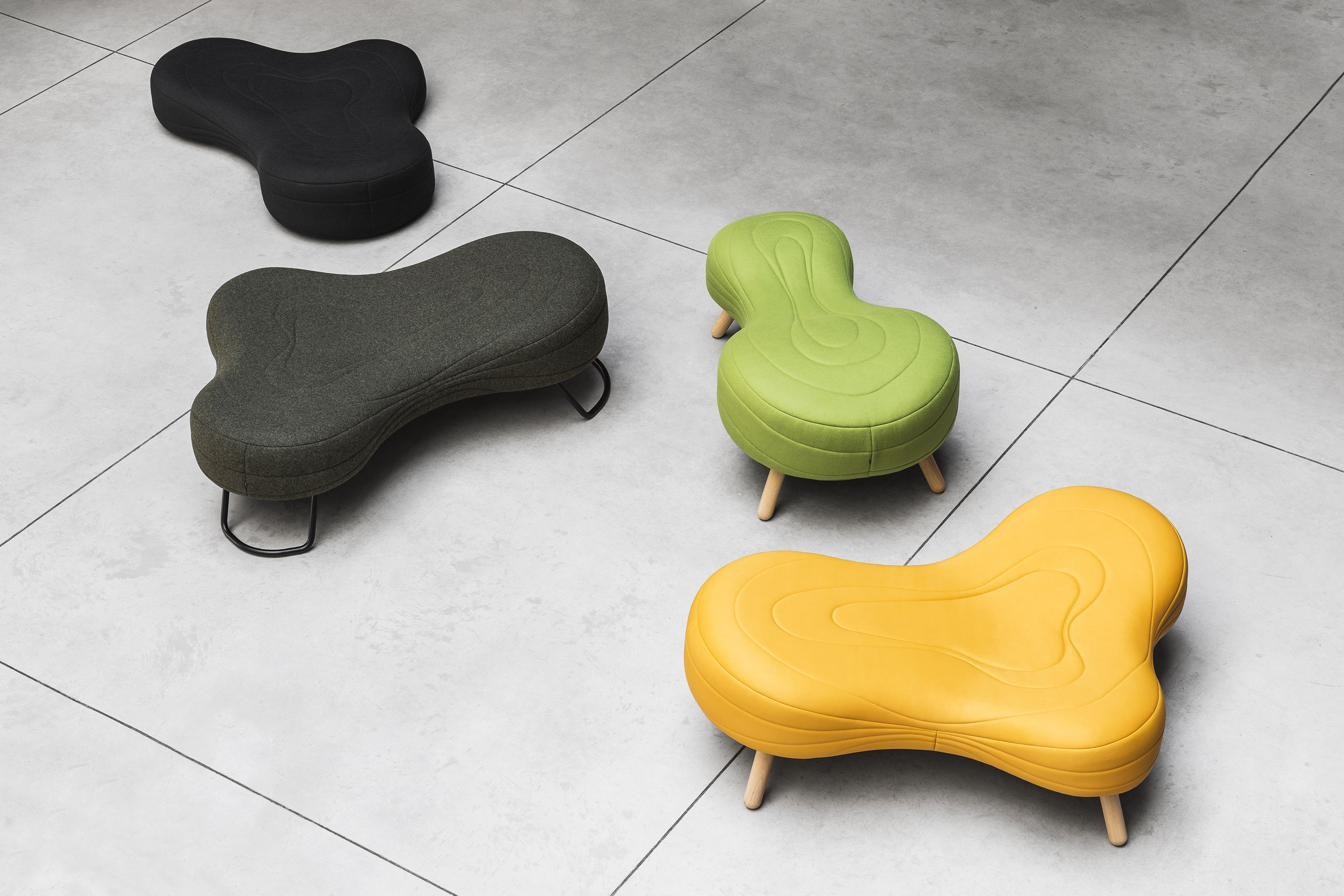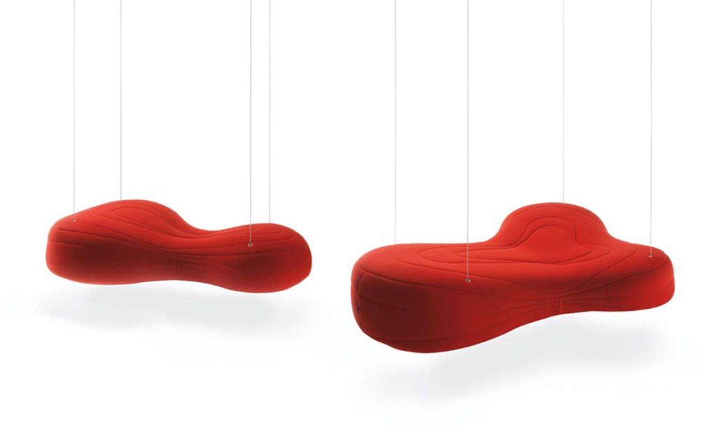 不规则的、变形的沙发形式允许创造一个不寻常的公共空间。这些模块是用木制的腿,小的隐藏的腿,这样沙发看起来就像是直接躺在地上,或者悬挂在绳子上,给人一种漂浮在空中的感觉。设计的主要特点是有可能在功能和外观方面提供不同的基础。这些座椅有两人位和三人位型号可供选择。