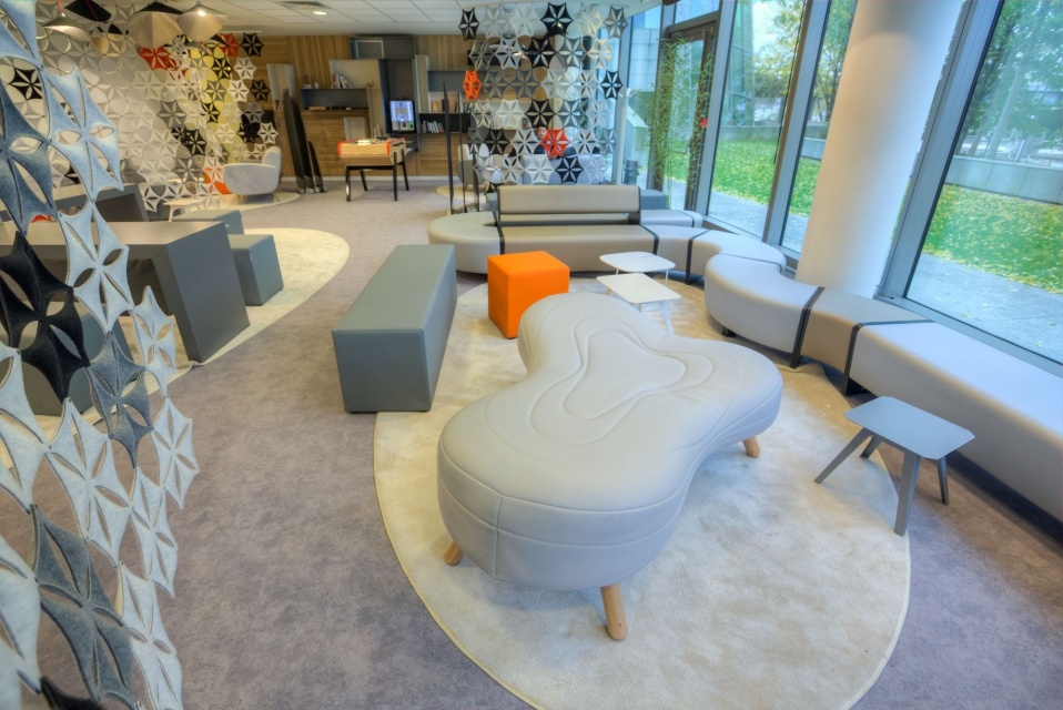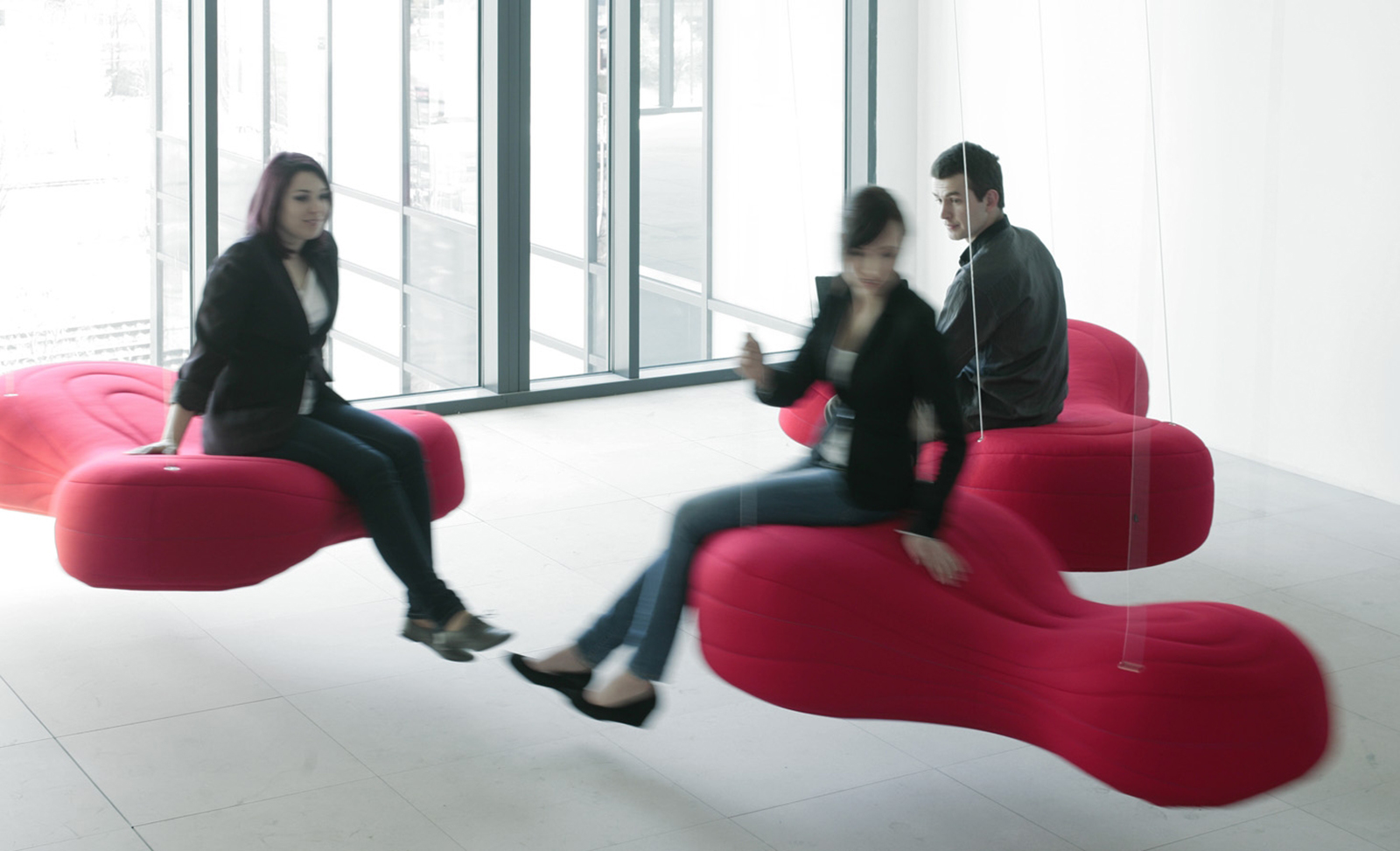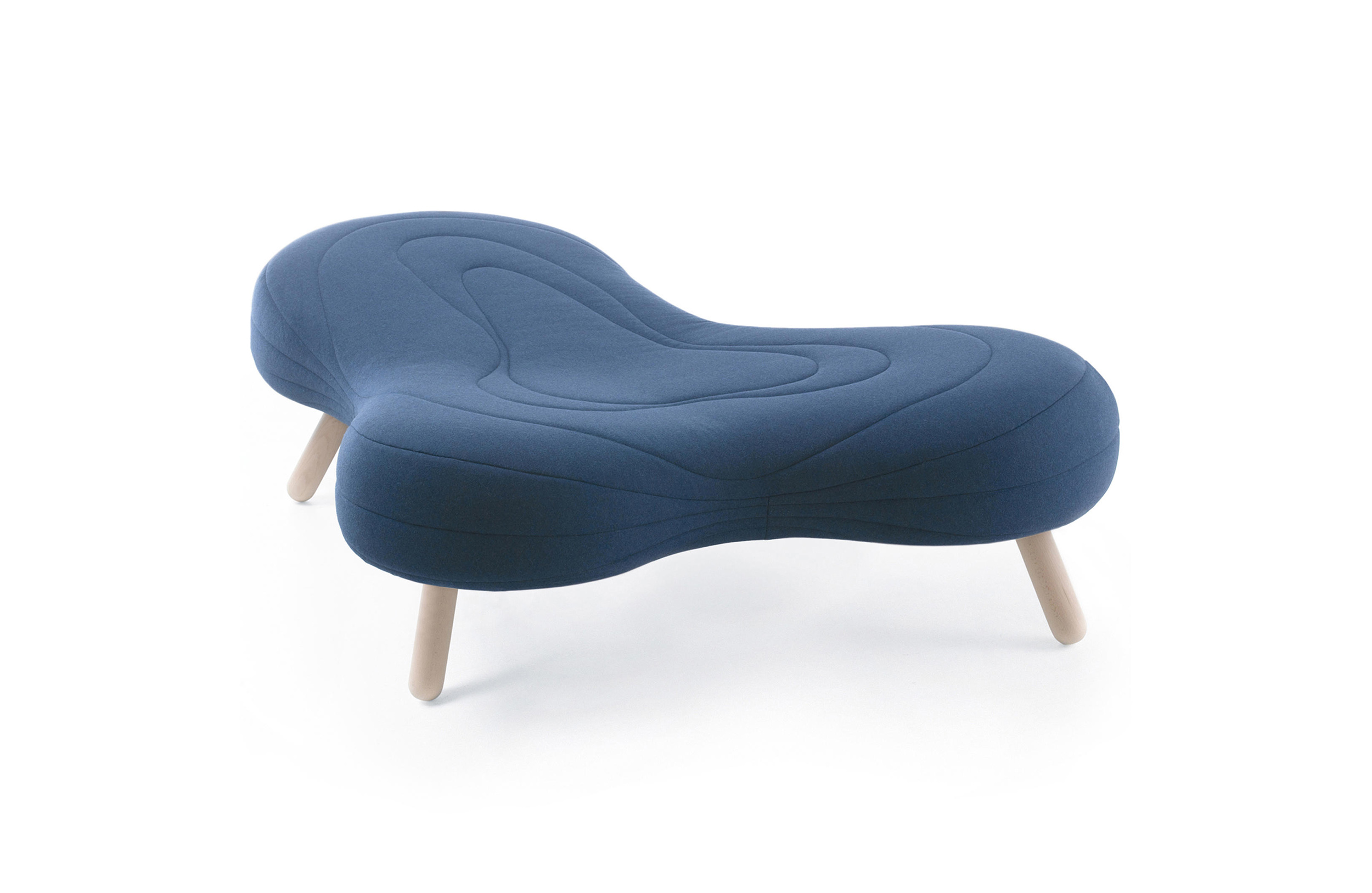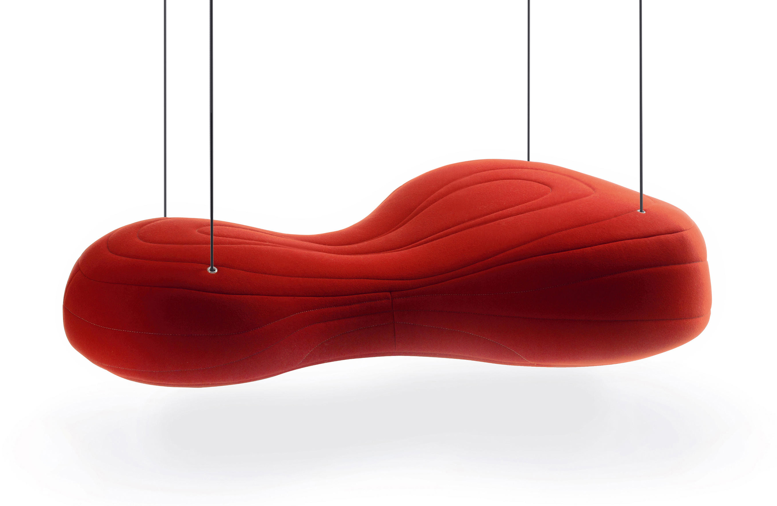 不规则的、变形的沙发形式允许创造一个不寻常的公共空间。这些模块是用木制的腿,小的隐藏的腿,这样沙发看起来就像是直接躺在地上,或者悬挂在绳子上,给人一种漂浮在空中的感觉。设计的主要特点是有可能在功能和外观方面提供不同的基础。这些座椅有两人位和三人位型号可供选择。