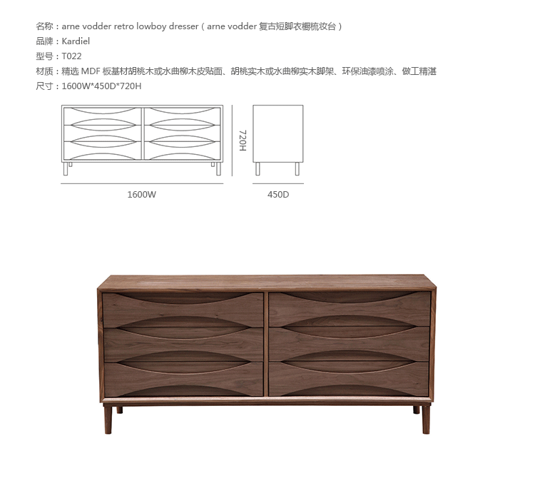 arne vodder retro lowboy dresser(arne vodder复古短脚衣橱梳妆台)是Kardiel公司制作的经典实木家具,具有世纪中期的现代风格,6个滑动式抽屉通过精心制作,提供足够的空间存放衣物或其他物品。在现代主义的存储家具上, Finn Juhl和 Arne Vodder 最先尝试胶木和天然木的组合运用。这是大胆的创新,他们结合传统的新鲜的新兴技术与现代主义的概念。制作采用精选MDF板基材胡桃木或水曲柳木皮贴面、胡桃实木或水曲柳实木脚架、环保油漆喷涂、做工精湛。