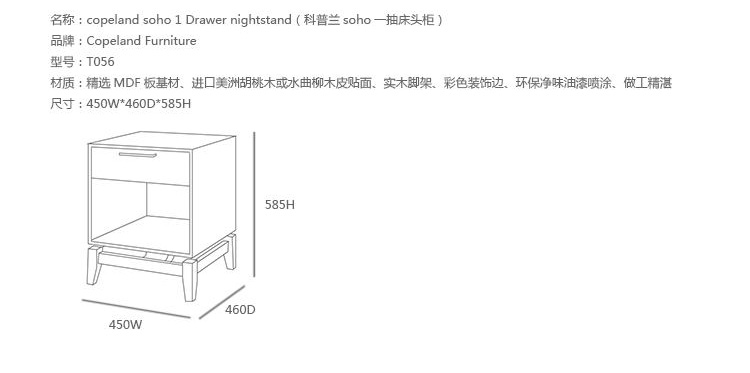copeland soho 1 Drawer nightstand(科普兰soho一抽床头柜)是Copeland Furniture公司copeland实木系列之一。我们塑造环境,然后环境塑造我们,copeland旨在传递的舒适度和清晰度的感情。设计借用了一些最优秀的传统和当代的设计要素,非常具有特色。这个中世纪现代风格的设计,提供了一个抽屉存储空间,可以使您更好的归纳自己的物品。制作采用精选MDF板基材、进口美洲胡桃木,贴面、实木脚架、彩色装饰边、环保净味油漆喷涂、做工精湛。