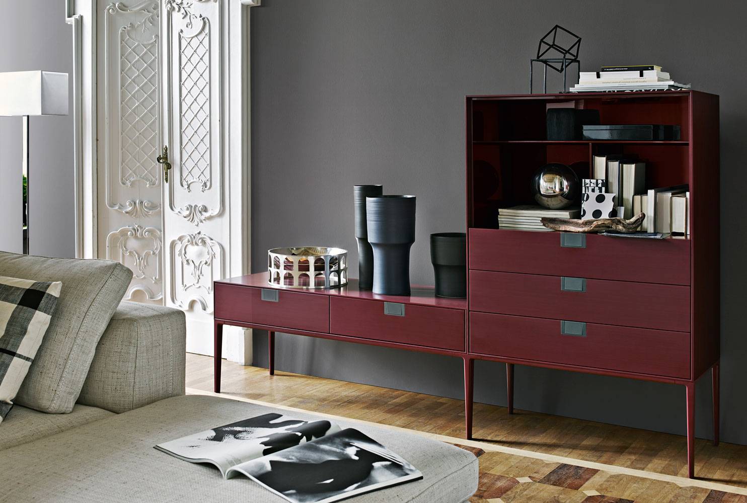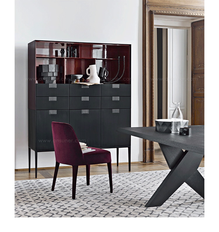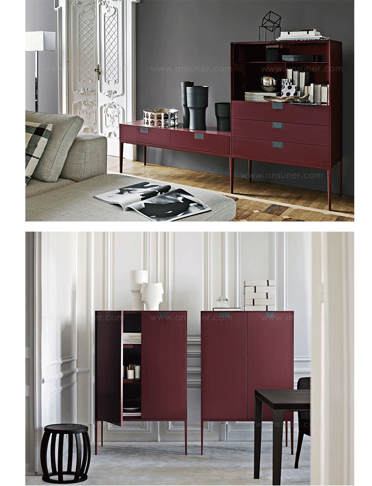 无论是在生活区域,入口处或办公室,这些箱子将优雅地解决任何存储需求。 可提供双扇门,皮瓣或在一个开放的版本。 他们简单,目前的设计配上宝贵的红色和黑色法国波兰,让人想起东,揭示大专业知识和技艺。