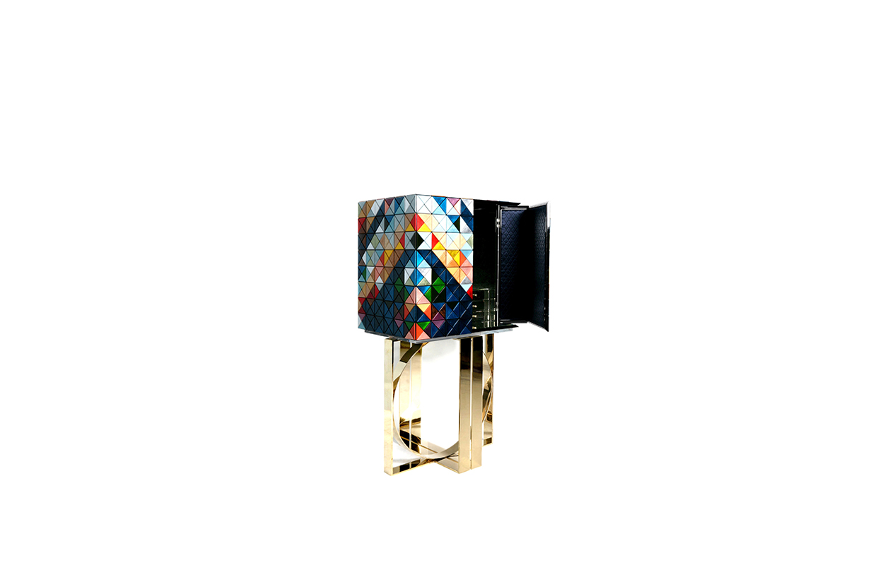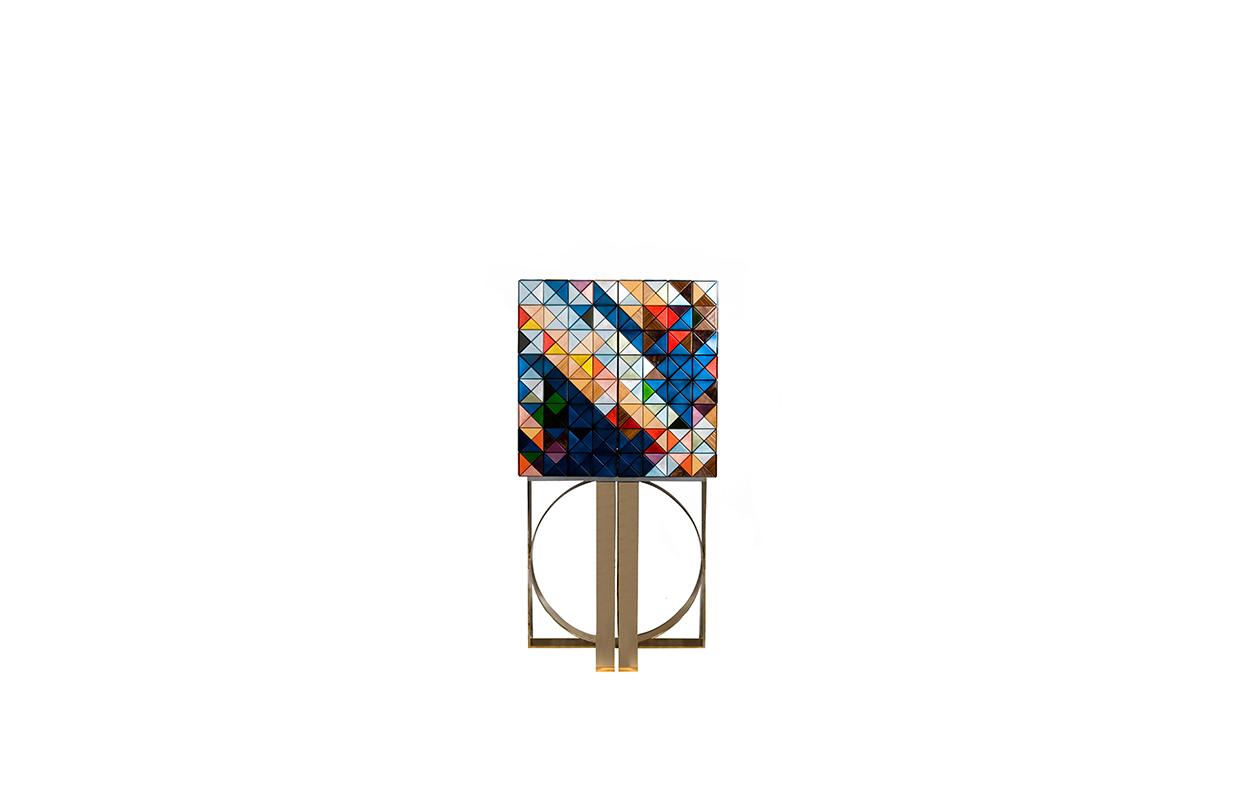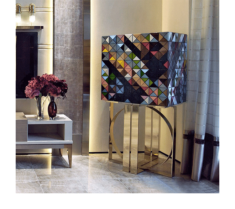 1088木森林的多样性和完成三角形:银叶,金箔,彩色涂料,十个不同类型的木材叶(乌木单板、非洲胡桃木单板、zebrano单板,杨树单板,黑黄檀。 室内:两扇门在里面完成钻石绗缝蓝色丝绸织物开放九个抽屉用金旋钮和内阁空间所有年龄在镜子里完成。 基础:抛光黄铜