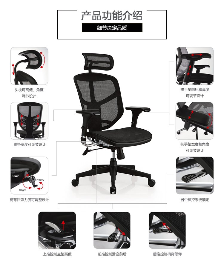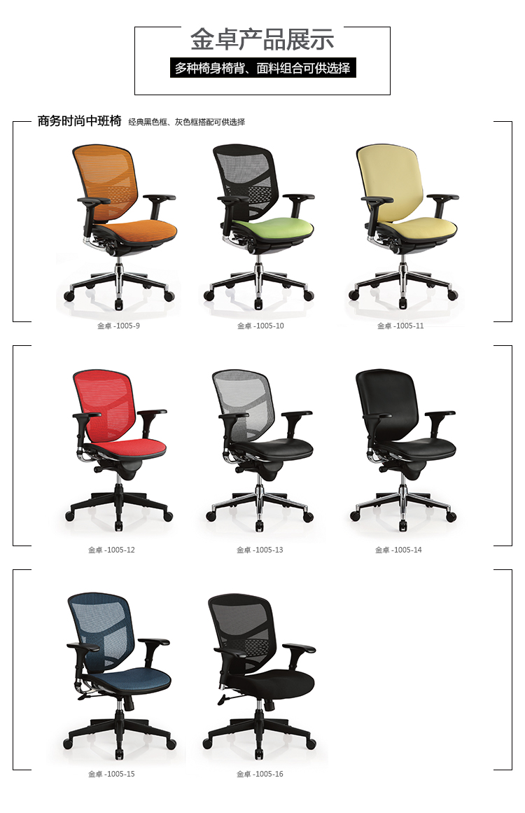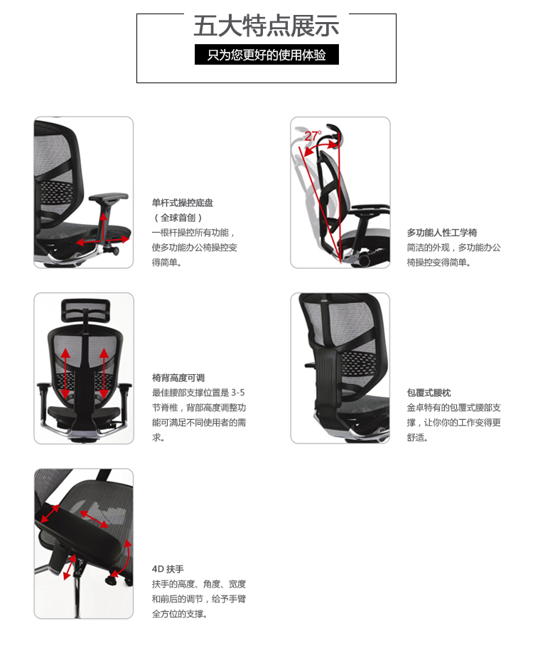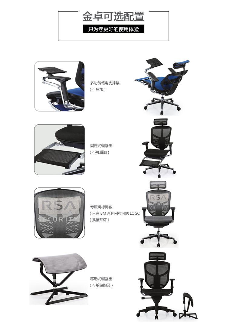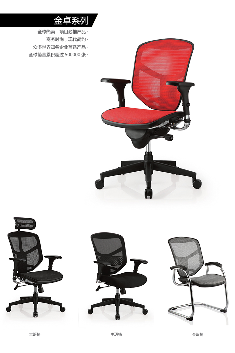 金卓系列采用完全性多功能调整设计,从椅背到座垫可进行全方位的调整