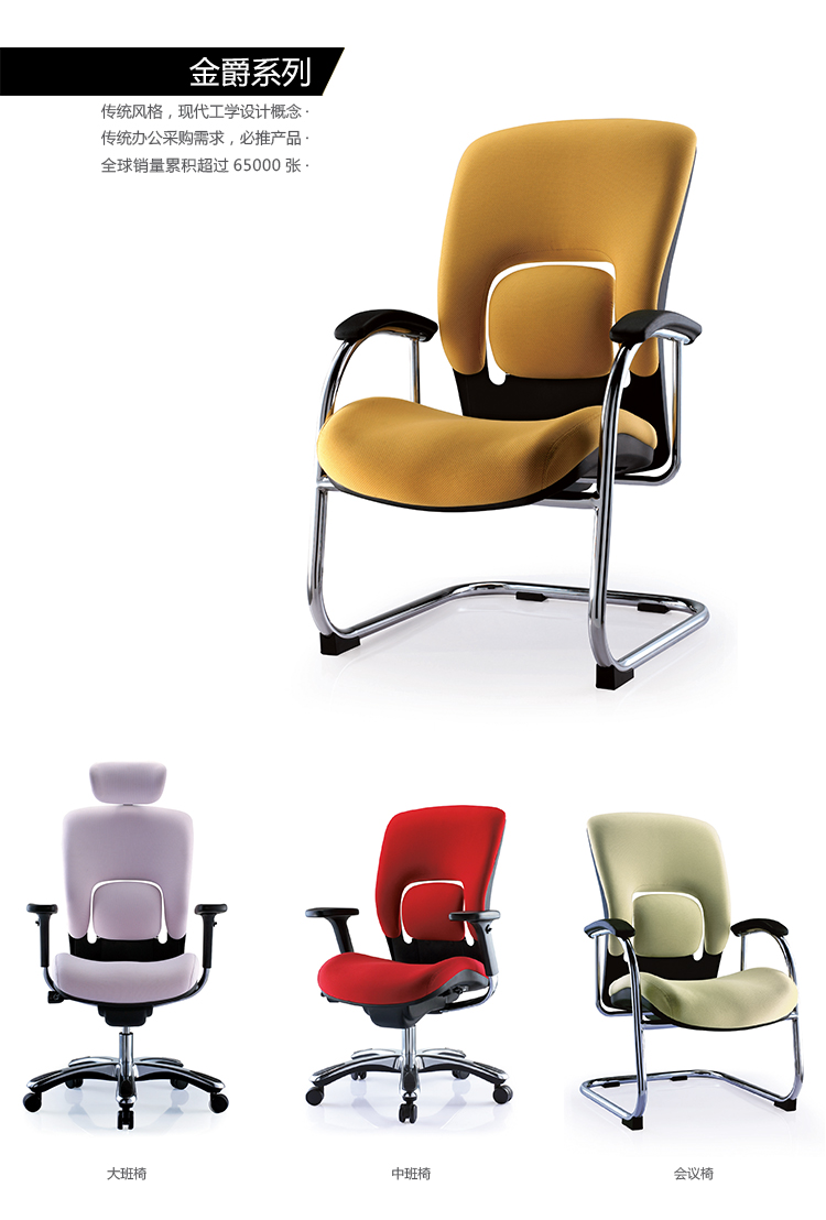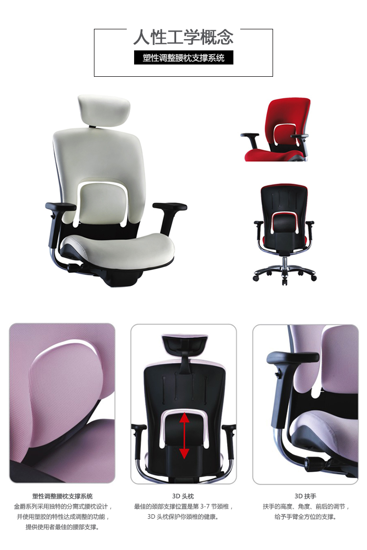 金爵系列采用独特的分离式腰枕设计,并使用塑胶的特性达成调整的功能,提供使用者最佳的腰部支撑;
