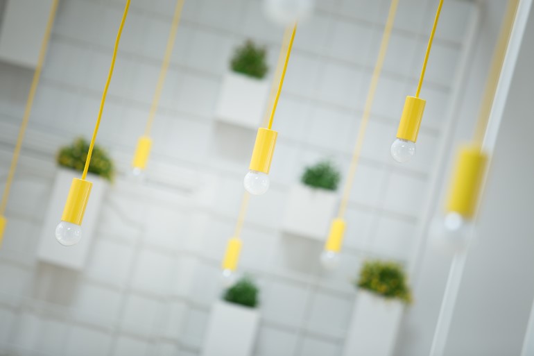 在前门附近,为管理者设置了两处办公区,并为到访的客户设计了一组漂亮的组合坐凳。前台后侧靠左边的地方,设计了一排背靠背沙发座工作区。金属框架的沙发除了耐久实用,还让人有安全感和舒适的体验。顶面垂下的灯具与沙发靠垫色彩形成呼应,为简约的空间带来精彩的创意效果。沙发座的尽头有一扇门(功能需求不能拆除),因此采用巧妙的小设计将其隐藏。沙发座靠近入口的那一端,用金属管设计了一组装饰柜,即具装饰性也为管理人员提供储物的功能。