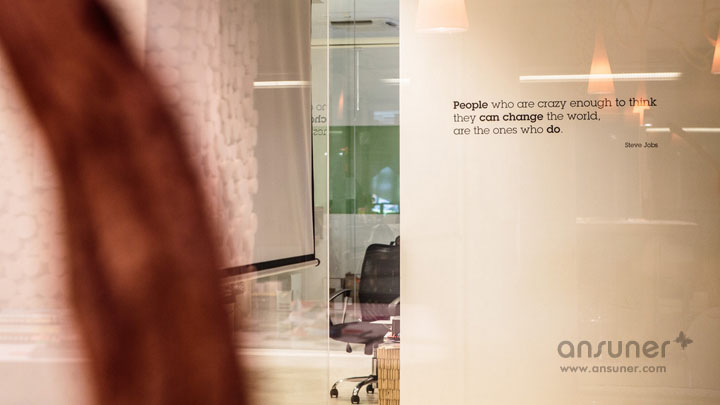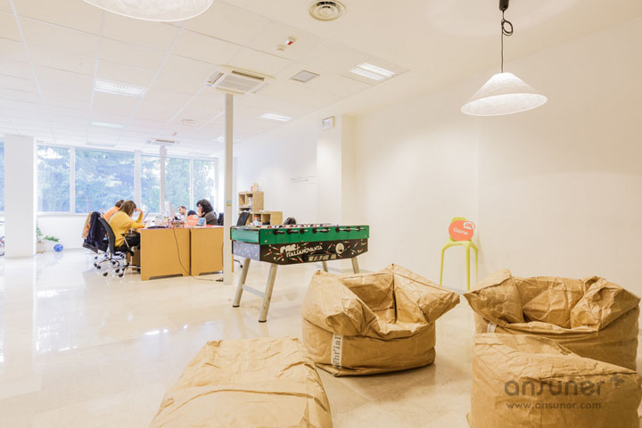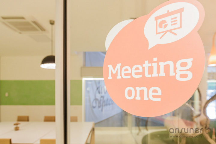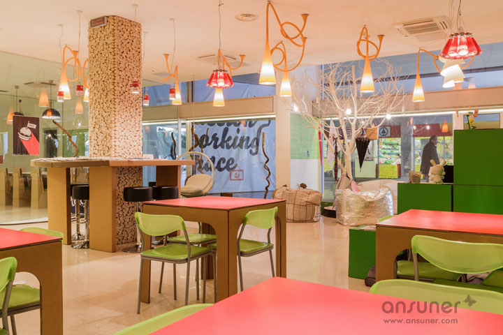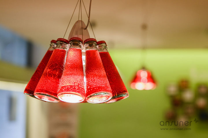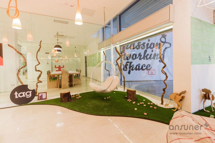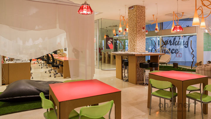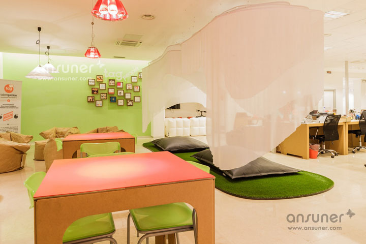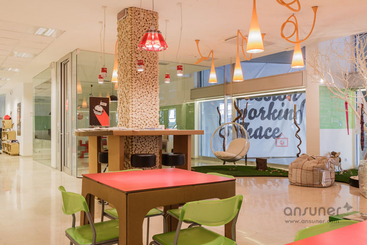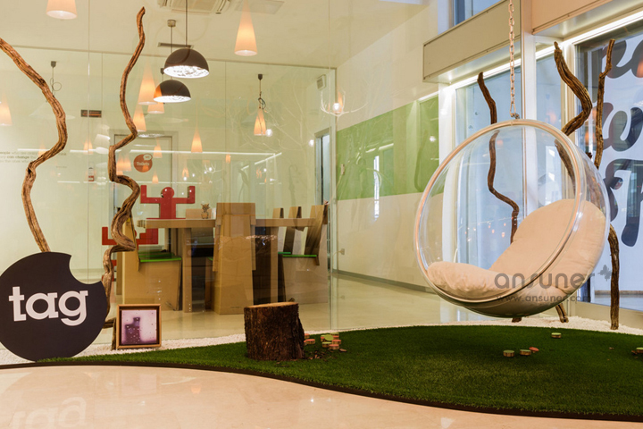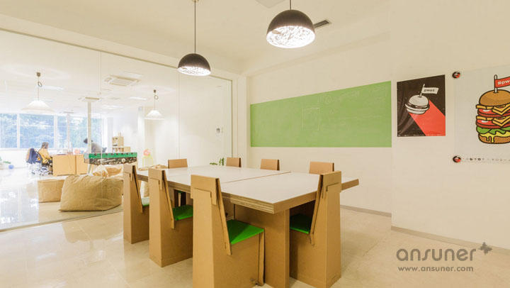 纸板家具、球形吊椅、缠绕垂挂灯具、创意饮料瓶装饰灯、清新的色彩,可爱的巧心机设计弥漫在室内每一个角落,创意的氛围一如他们的创意理念,将传统世界与网络世界、创新思潮碰撞、激荡、交融在一起。