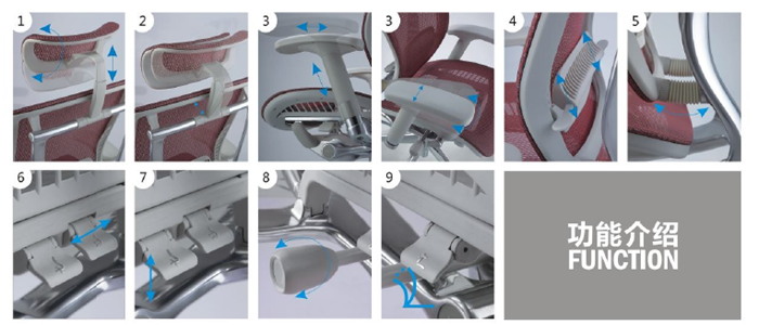 4、底盘:多功能线控底盘,座垫可高低与座深调整,背可后仰,座旁式后仰弹力调整,令使用者腿部与背部更平衡,自然而倍感舒适。