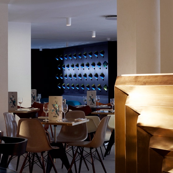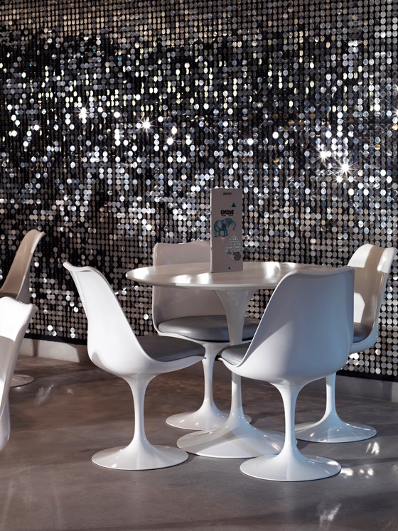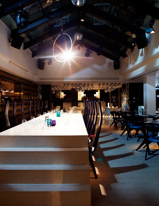Design Brief Design Research Studio was asked to create a dynamic venue for a new concept in dining. The premise was to create a spectacular atmosphere which combines fine dining with an informal atmosphere, where the customers feel inclined to dance and participate with surprising circus and burlesque performances. The interior was to reflect the ‘circus concept’ within a flexible design. Design Challenges The main challenge was transforming the drinking and dining experience into a simultaneously stimulating entertainment space. This includes a series of flexible design features which allow for a variety of entertainment opportunities. In order to create integrity with the performance aspect of the brief, Design Research Studio referenced the history of the building as the Royal Opera House menagerie. Design Results The surrealist inspired design incorporates a landscaped ceiling of mirrored globes, a kaleidoscopic reception desk and a kinetic, 3d art wall. The bespoke furniture engages and entertains: the main dining table doubles as a stage (which moves to allow for a larger dance floor), the step into the lounge integrates a dance pole, a mirrored WC lobby houses a hidden water-fountain and animal inspired furniture encourage participation and conversation.