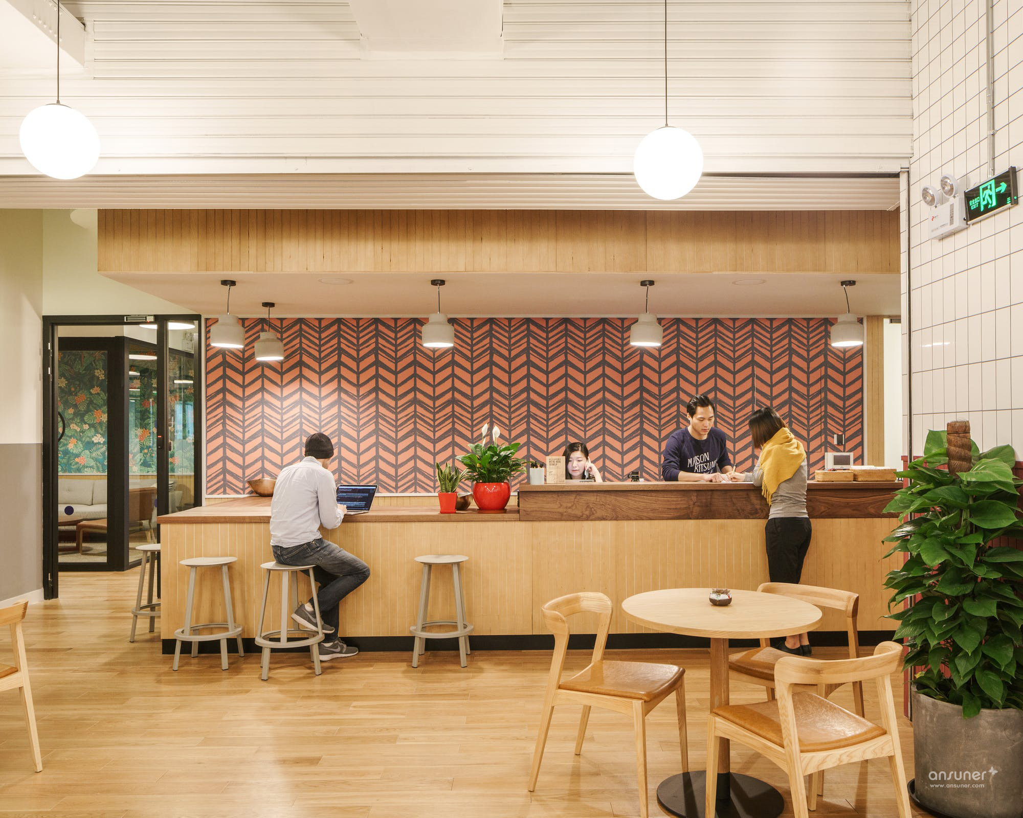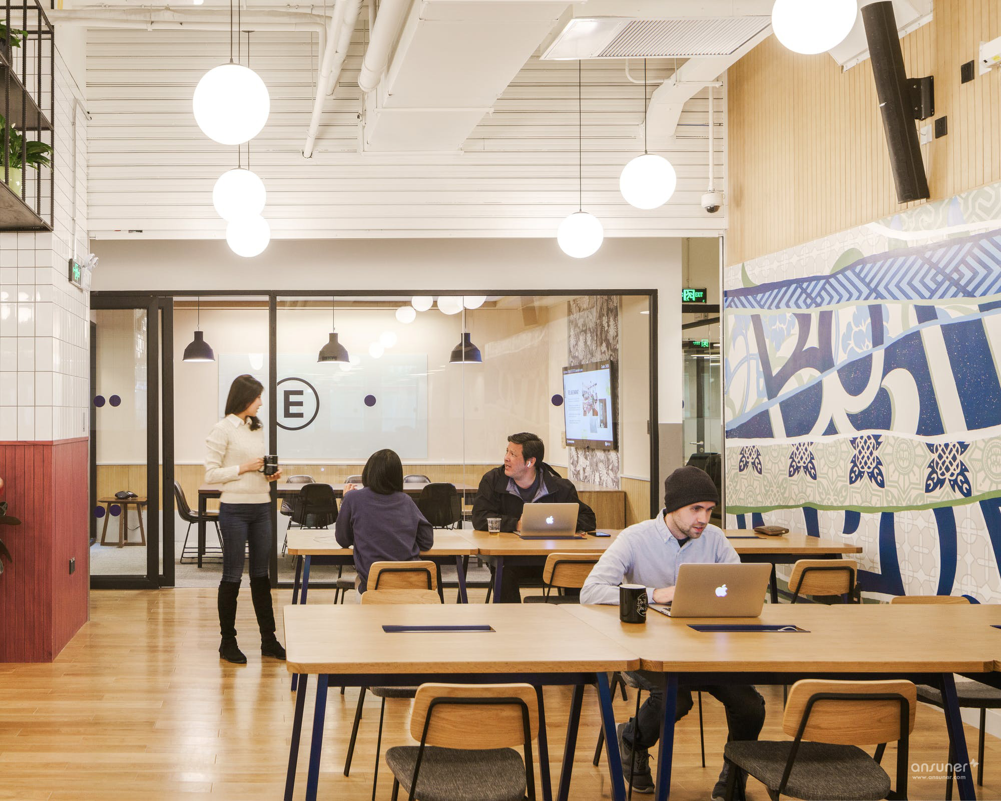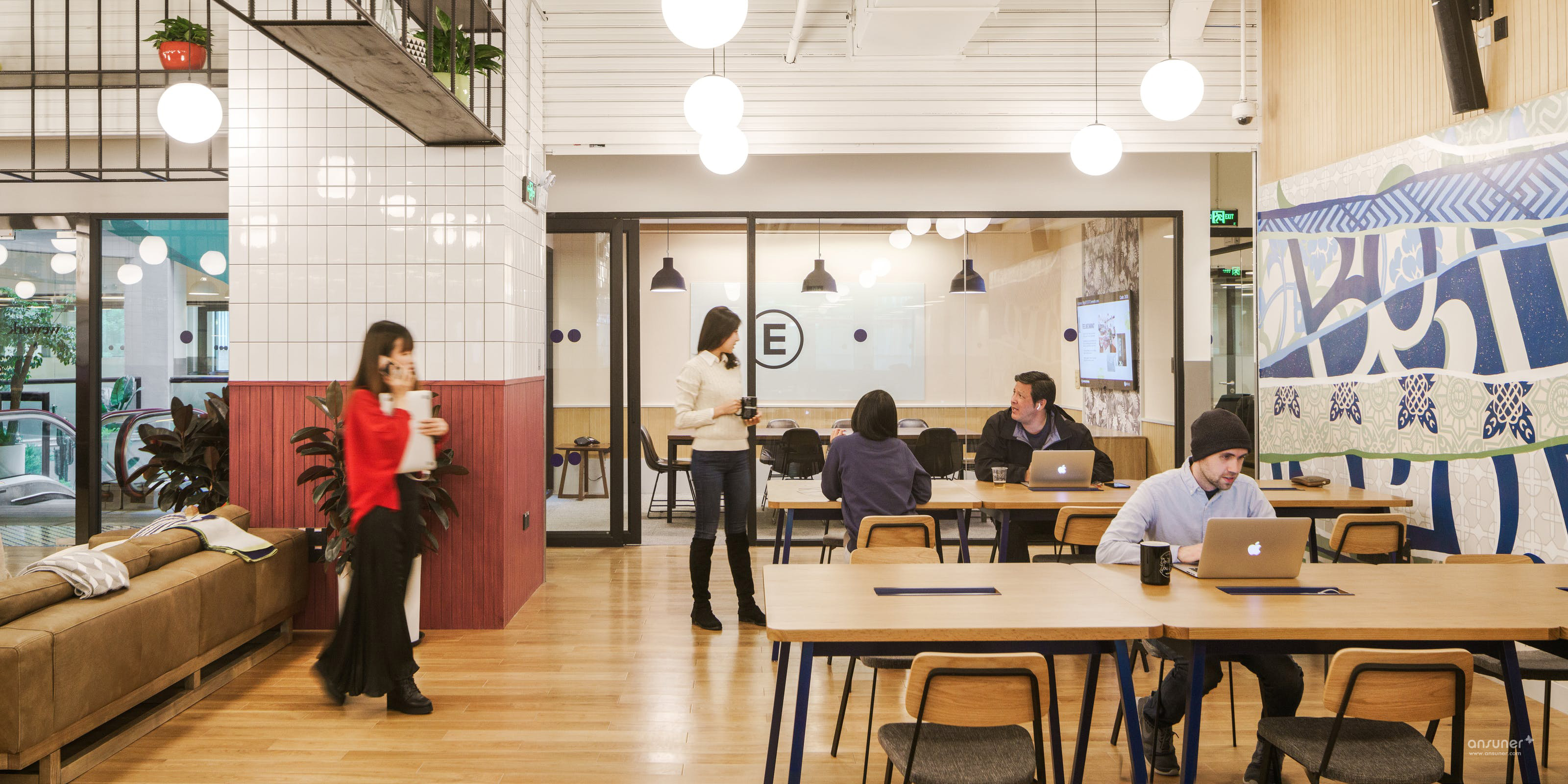 公共空间左侧是一幅本土画工手绘壁画,色彩明快充满张力,不规则变形图案则来自中国新疆地区及古丝绸之路中常见的植物花纹装饰。古丝绸之路跨越了东西方及欧亚大陆文明,衍生出了明显带有不同地域文明的装饰图案,都被设计师通过不同层次的用色,融合在这一壁画中。蓝色及灰色变形字母,则是WeWork所倡导的办公文化:Better Together (一起创造),而在公共空间右边的社区接待处,更是有红色霓虹灯的Better Together字样遥相呼应。