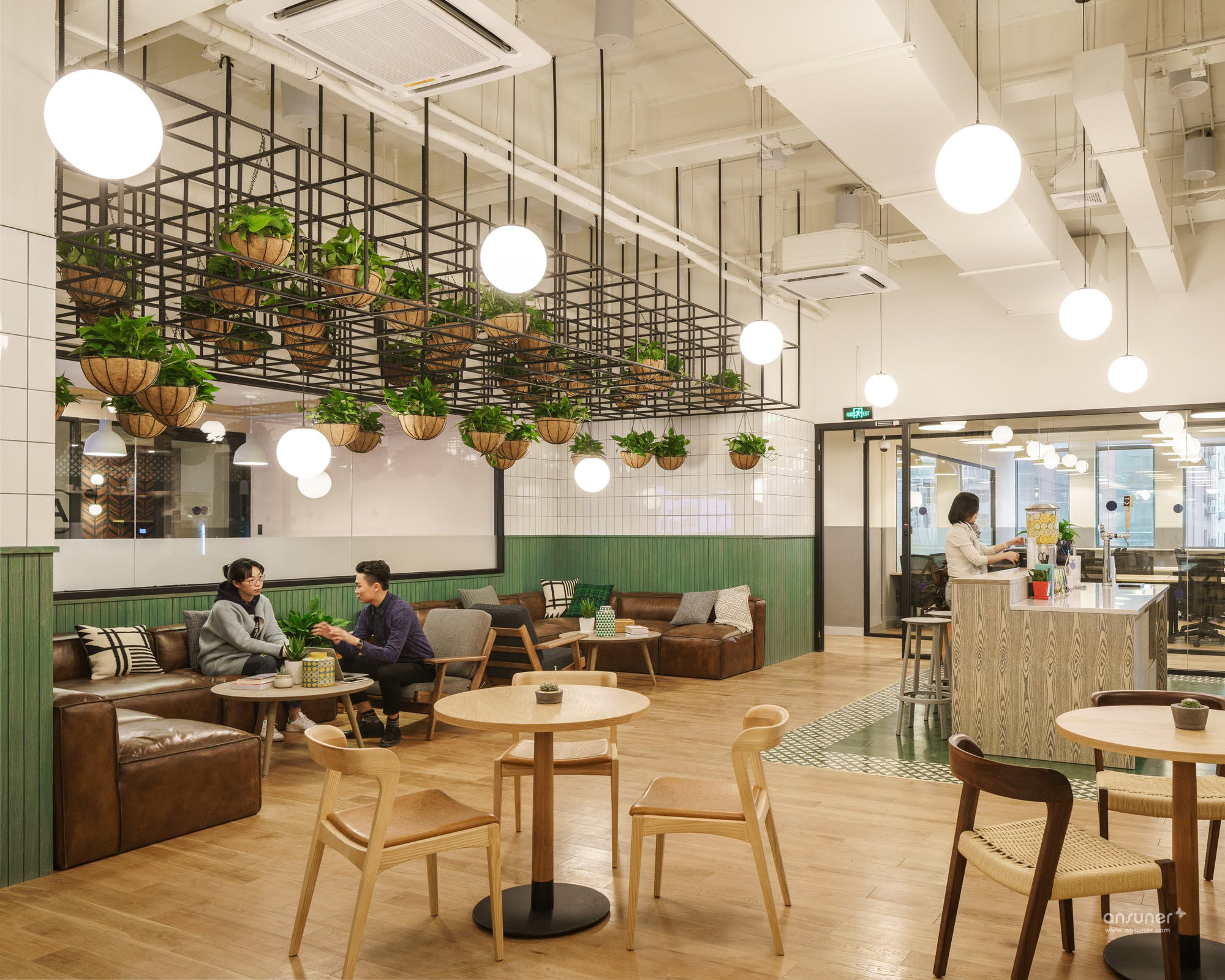 三楼公共区域则为会员提供了宽大舒适的皮质沙发,同时设计师再次在公共区域使用了大面积黑色铁质框架和绿色植物,而三楼茶水间的地面则铺设了绿色的瓷砖。
