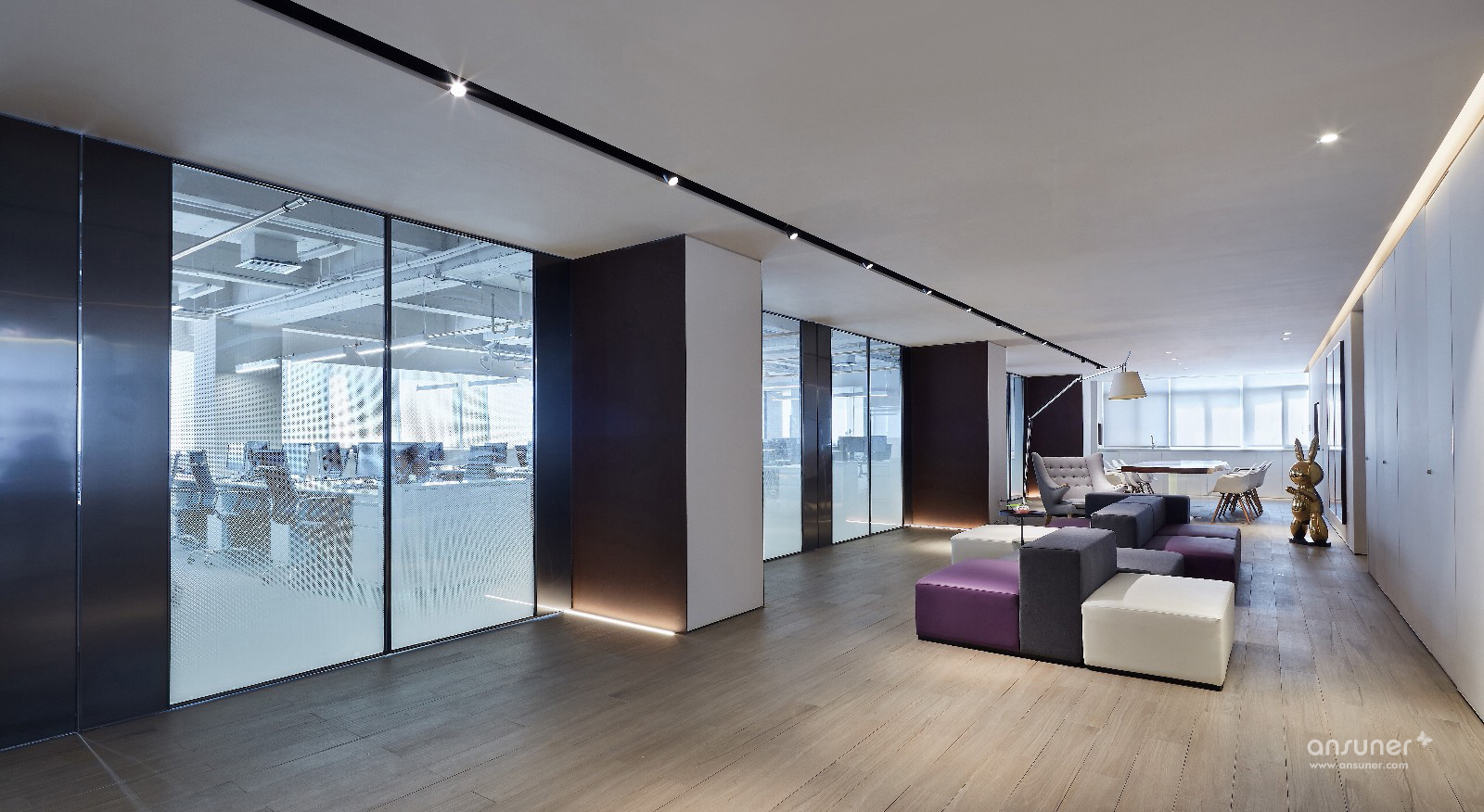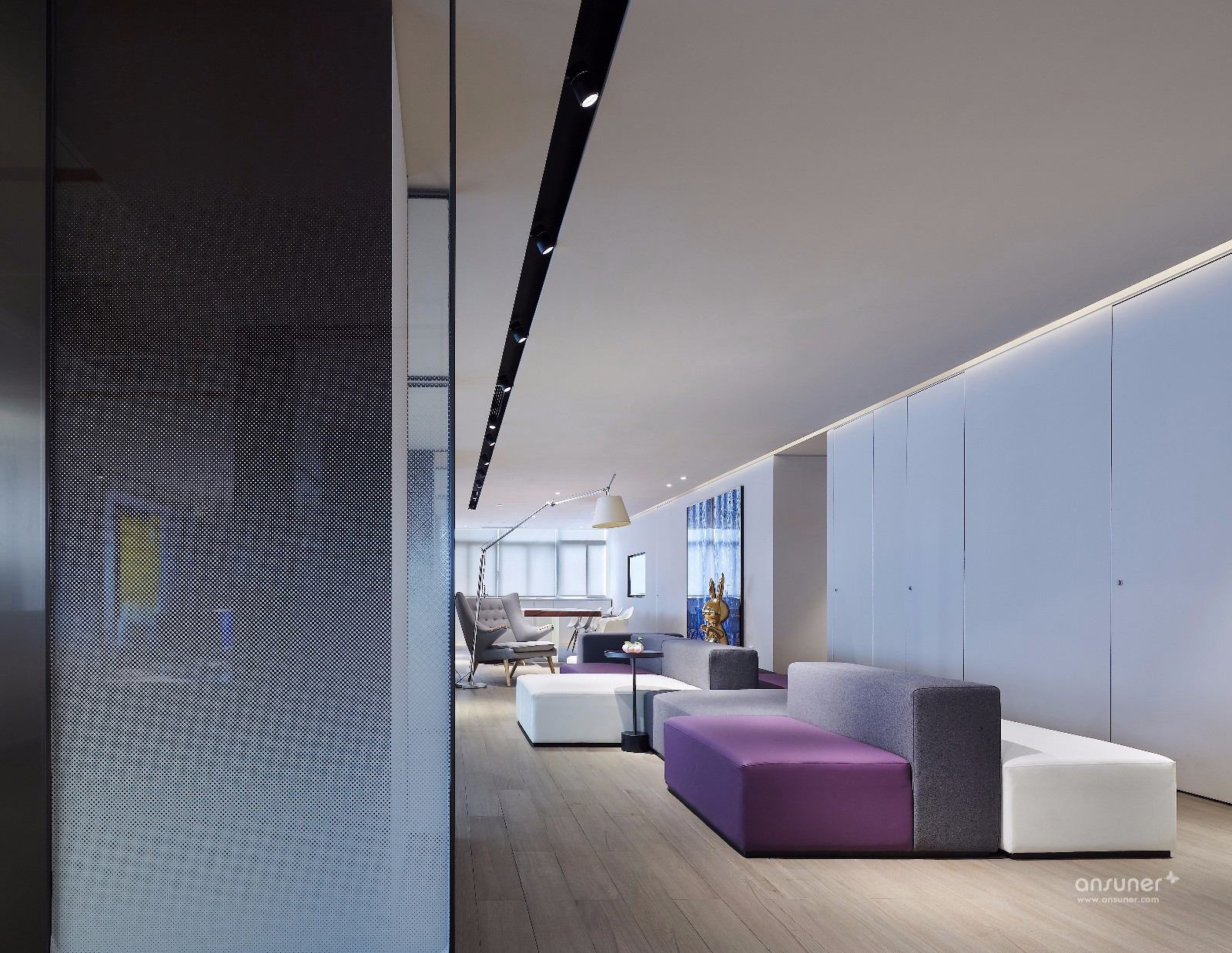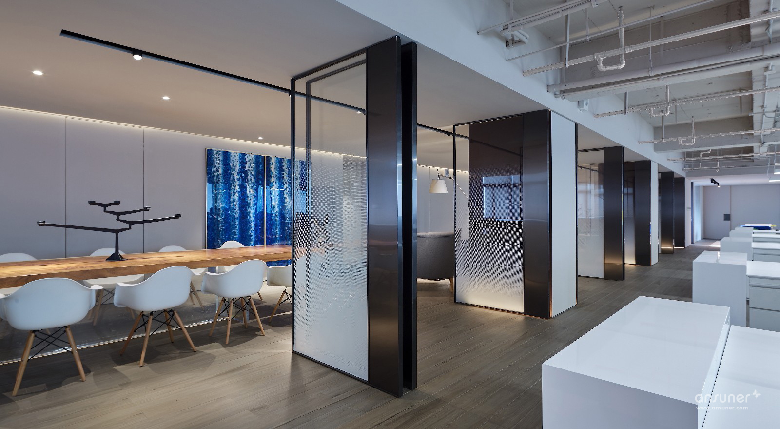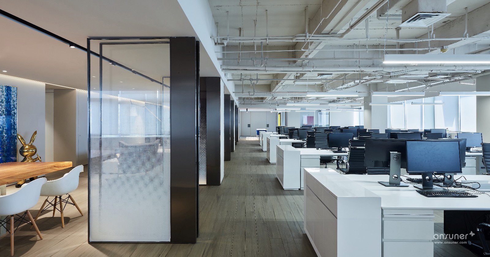 飞视设计之家这种办公组合形式给我们带来了一种开放式的空间体验:在这空间中,室内空间的划分十分灵活,通过家具的组织,形成不同的分区,传统的门厅、走廊、办公室布局已经不复存在,取而代之的,是一个完全开敞式的流动空间。水吧区提供着办公空间基本的管理和服务;大讨论桌除了提供休闲之外,还可以作为共享的会议区使用;休闲区则有着更多的开阔性,除了阅读、休闲还适合两三人的小组工作和讨论;如果你不想被来往的人们所干扰,则可以一头埋进工作站中专注手头的工作……总之,设计师将灵动开敞的空间使用方式代入到了该办公空间中:你可以在这里任意选择最需要的使用空间。