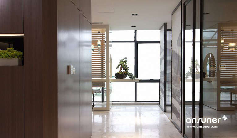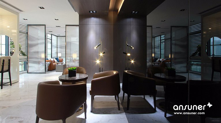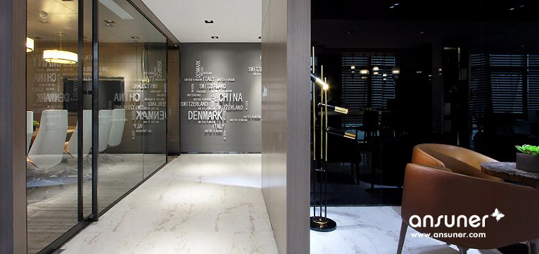 主要材料:石材、地毯、黑色不镜钢、壁布、皮革、烤漆板、木地板、木饰面