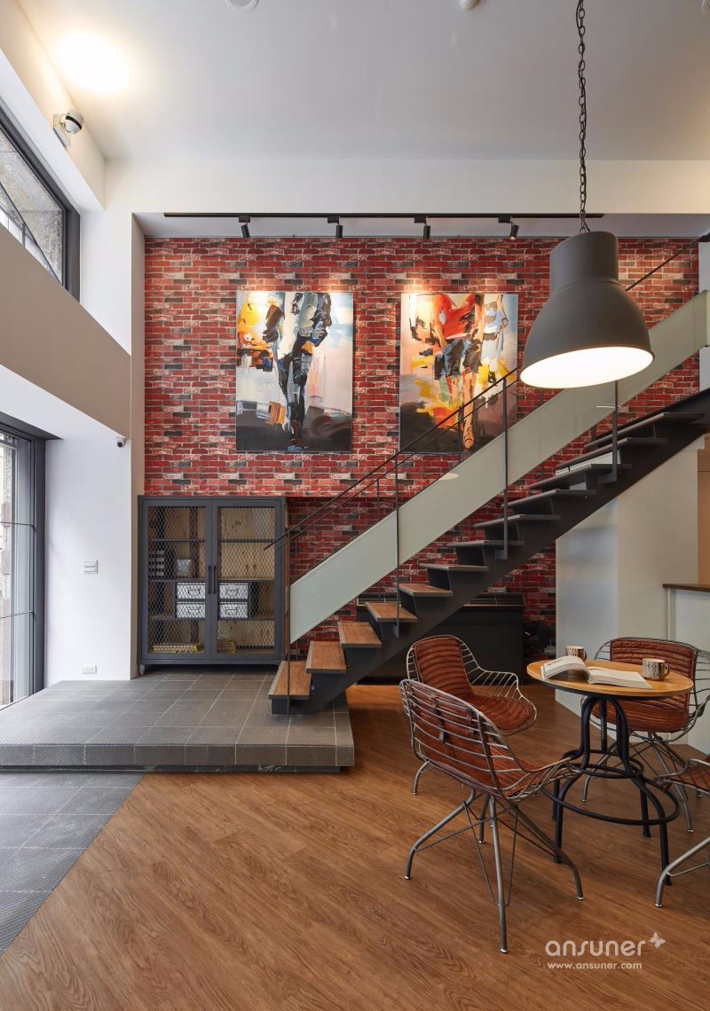善用挑高空间打造大面积落地窗,并以大量镂空铁件彰显利落气息,设计师更巧妙使用仿红砖壁纸、仿清水模漆以及木纹塑胶地砖,大幅降低装修预算,完成工业风格营造。以一道吧台巧妙分隔接待区与后方会议空间,兼具隐私与置物功用,更利用结构墙下方畸零空间规划柜体,拓增收纳机能。二楼以办公空间为主,以开放设计与纯白色调一扫传统 OA 办公的制式呆版,将有着通风孔设计的无印风置物柜贴齐壁面,让行进动线更加流畅,小型会议室的玻璃隔间更抹除狭小阴暗的可能性。