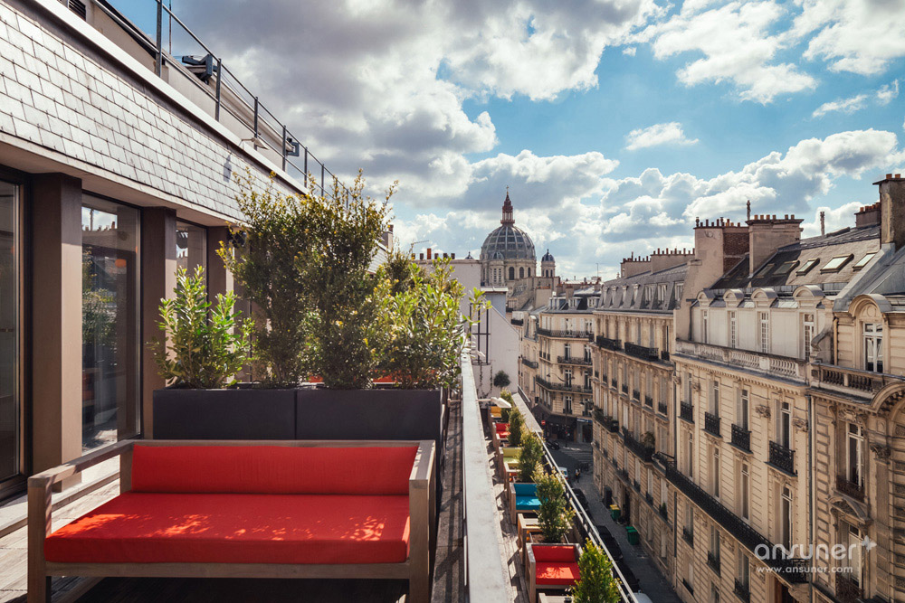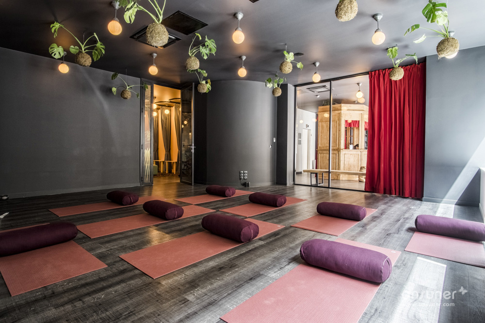 然而跳跃的色彩和当代设计又把你拉回到现实之境。比如大会议室长桌上方那些有趣的绿色植物、昏黄的球灯以及一旁书架上五颜六色的书籍;由印度 Yoga House 创始人 Maud Chuffart 指导设计的玫红与粉紫相间的瑜伽冥想室;红色天鹅绒与彩色软木块装饰的私密电话间;被称为“糖果沙龙”的休息区里那些荧光色系;顶楼露台上红色的长沙发等。