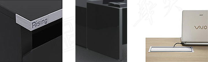 桌面配置有先进的多功能电动旋转插座,满足现代办公的要求。镜面高光的环保UV漆饰面,漆膜饱满、平整光亮,充分体现了现代办公环境得到宁静与明亮。