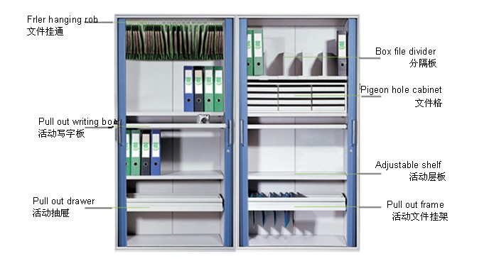 •柜内层板可摆放标准A4档案夹,层板下面可挂A4文件夹;